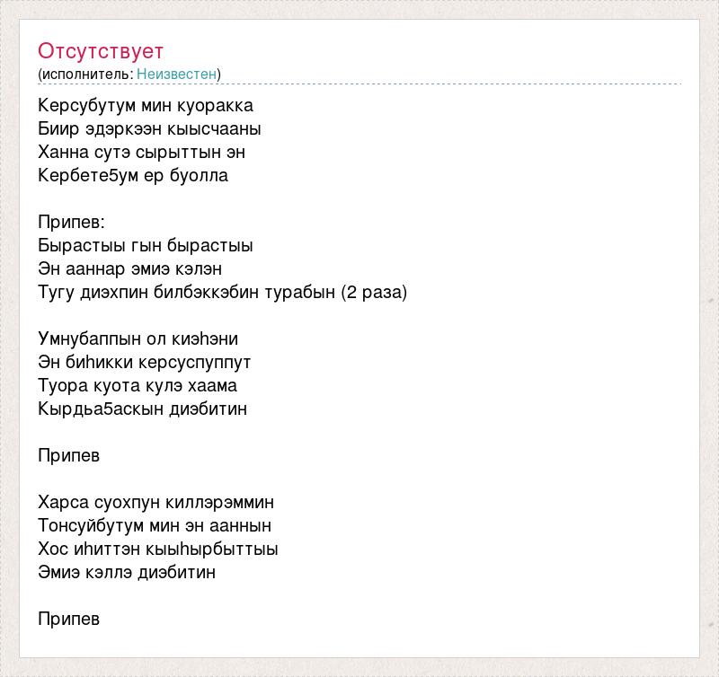 Керсубутум мин куоракка Биир эдэркээн кыысчааны Ханна сутэ сырыттын эн Кербете5ум ер буолла Припев: Бырастыы гын бырастыы Эн ааннар эмиэ кэлэн Тугу диэхпин билбэккэбин турабын (2 раза) Умнубаппын ол киэhэни Эн биhикки керсуспуппут Туора куота кулэ хаама Кырдьа5аскын диэбитин Припев Харса суохпун киллэрэммин Тонсуйбутум мин эн ааннын Хос иhиттэн кыыhырбыттыы Эмиэ кэллэ диэбитин Припев