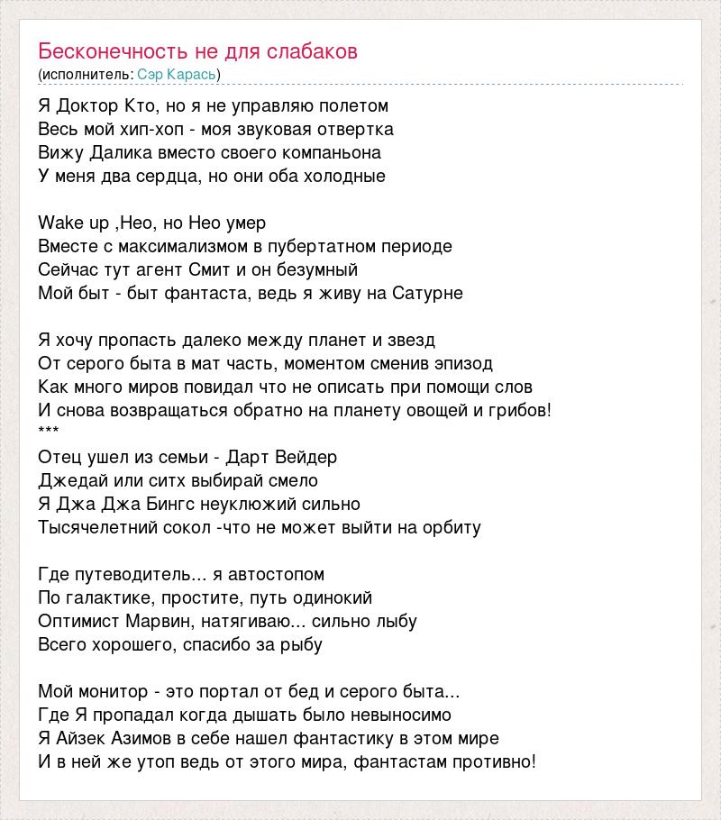 Я Доктор Кто, но я не управляю полетом Весь мой хип-хоп - моя звуковая отвертка Вижу Далика вместо своего компаньона У меня два сердца, но они оба холодные Wake up ,Нео, но Нео умер Вместе с максимализмом в пубертатном периоде Сейчас тут агент Смит и он безумный Мой быт - быт фантаста, ведь я живу на Сатурне Я хочу пропасть далеко между планет и звезд От серого быта в мат часть, моментом сменив эпизод Как много миров повидал что не описать при помощи слов И снова возвращаться обратно на планету овощей и грибов! *** Отец ушел из семьи - Дарт Вейдер Джедай или ситх выбирай смело Я Джа Джа Бингс неуклюжий сильно Тысячелетний сокол -что не может выйти на орбиту Где путеводитель... я автостопом По галактике, простите, путь одинокий Оптимист Марвин, натягиваю... сильно лыбу Всего хорошего, спасибо за рыбу Мой монитор - это портал от бед и серого быта... Где Я пропадал когда дышать было невыносимо Я Айзек Азимов в себе нашел фантастику в этом мире И в ней же утоп ведь от этого мира, фантастам противно!
