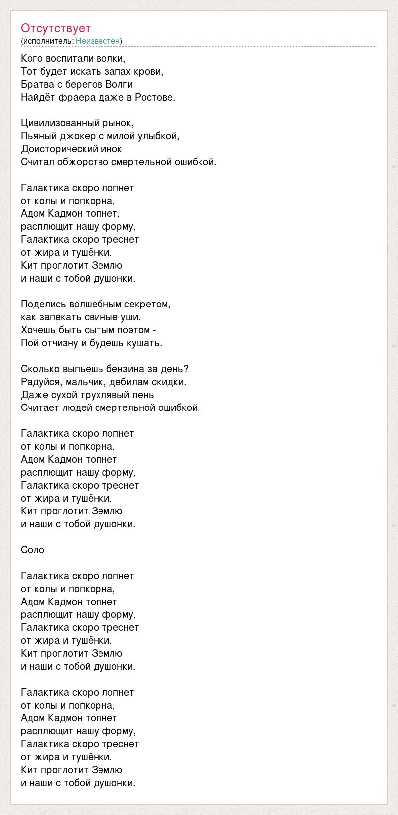 Кого воспитали волки, Тот будет искать запах крови, Братва с берегов Волги Найдёт фраера даже в Ростове. Цивилизованный рынок, Пьяный джокер с милой улыбкой, Доисторический инок Считал обжорство смертельной ошибкой. Галактика скоро лопнет от колы и попкорна, Адом Кадмон топнет, расплющит нашу форму, Галактика скоро треснет от жира и тушёнки. Кит проглотит Землю и наши с тобой душонки. Поделись волшебным секретом, как запекать свиные уши. Хочешь быть сытым поэтом - Пой отчизну и будешь кушать. Сколько выпьешь бензина за день? Радуйся, мальчик, дебилам скидки. Даже сухой трухлявый пень Считает людей смертельной ошибкой. Галактика скоро лопнет от колы и попкорна, Адом Кадмон топнет расплющит нашу форму, Галактика скоро треснет от жира и тушёнки. Кит проглотит Землю и наши с тобой душонки. Соло Галактика скоро лопнет от колы и попкорна, Адом Кадмон топнет расплющит нашу форму, Галактика скоро треснет от жира и тушёнки. Кит проглотит Землю и наши с тобой душонки. Галактика скоро лопнет от колы и попкорна, Адом Кадмон топнет расплющит нашу форму, Галактика скоро треснет от жира и тушёнки. Кит проглотит Землю и наши с тобой душонки.