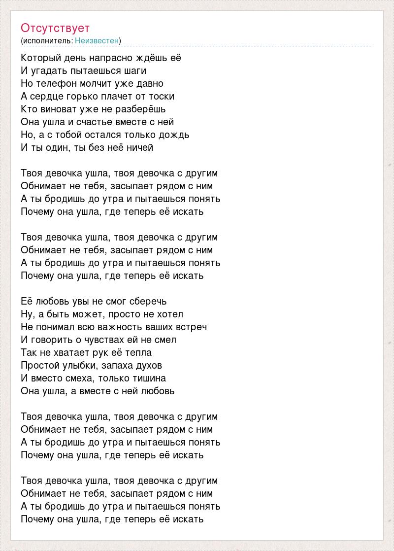 Который день напрасно ждёшь её И угадать пытаешься шаги Но телефон молчит уже давно А сердце горько плачет от тоски Кто виноват уже не разберёшь Она ушла и счастье вместе с ней Но, а с тобой остался только дождь И ты один, ты без неё ничей Твоя девочка ушла, твоя девочка с другим Обнимает не тебя, засыпает рядом с ним А ты бродишь до утра и пытаешься понять Почему она ушла, где теперь её искать Твоя девочка ушла, твоя девочка с другим Обнимает не тебя, засыпает рядом с ним А ты бродишь до утра и пытаешься понять Почему она ушла, где теперь её искать Её любовь увы не смог сберечь Ну, а быть может, просто не хотел Не понимал всю важность ваших встреч И говорить о чувствах ей не смел Так не хватает рук её тепла Простой улыбки, запаха духов И вместо смеха, только тишина Она ушла, а вместе с ней любовь Твоя девочка ушла, твоя девочка с другим Обнимает не тебя, засыпает рядом с ним А ты бродишь до утра и пытаешься понять Почему она ушла, где теперь её искать Твоя девочка ушла, твоя девочка с другим Обнимает не тебя, засыпает рядом с ним А ты бродишь до утра и пытаешься понять Почему она ушла, где теперь её искать
