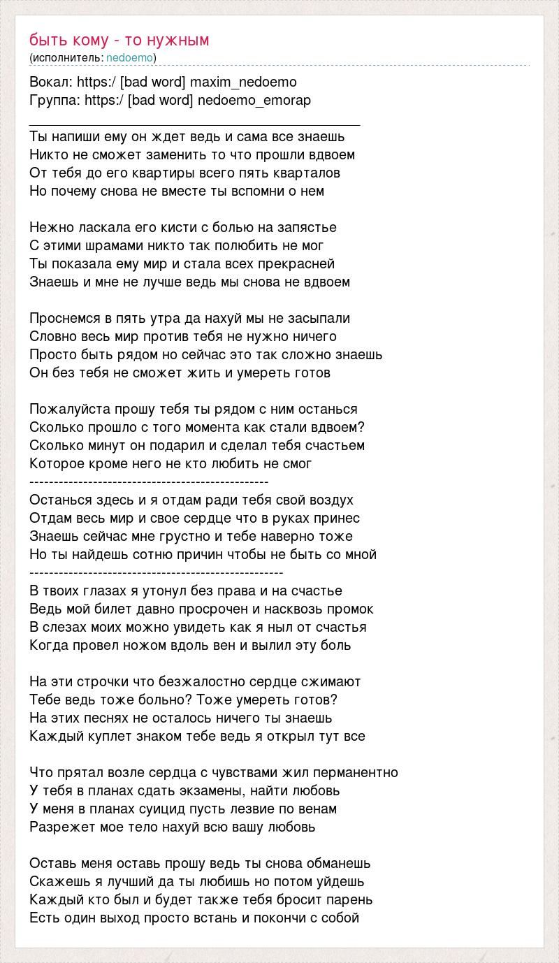 Вокал: https:/ [bad word] maxim_nedoemo Группа: https:/ [bad word] nedoemo_emorap ___________________________________________ Ты напиши ему он ждет ведь и сама все знаешь Никто не сможет заменить то что прошли вдвоем От тебя до его квартиры всего пять кварталов Но почему снова не вместе ты вспомни о нем Нежно ласкала его кисти с болью на запястье С этими шрамами никто так полюбить не мог Ты показала ему мир и стала всех прекрасней Знаешь и мне не лучше ведь мы снова не вдвоем Проснемся в пять утра да нахуй мы не засыпали Словно весь мир против тебя не нужно ничего Просто быть рядом но сейчас это так сложно знаешь Он без тебя не сможет жить и умереть готов Пожалуйста прошу тебя ты рядом с ним останься Сколько прошло с того момента как стали вдвоем? Сколько минут он подарил и сделал тебя счастьем Которое кроме него не кто любить не смог ------------------------------------------------- Останься здесь и я отдам ради тебя свой воздух Отдам весь мир и свое сердце что в руках принес Знаешь сейчас мне грустно и тебе наверно тоже Но ты найдешь сотню причин чтобы не быть со мной ---------------------------------------------------- В твоих глазах я утонул без права и на счастье Ведь мой билет давно просрочен и насквозь промок В слезах моих можно увидеть как я ныл от счастья Когда провел ножом вдоль вен и вылил эту боль На эти строчки что безжалостно сердце сжимают Тебе ведь тоже больно? Тоже умереть готов? На этих песнях не осталось ничего ты знаешь Каждый куплет знаком тебе ведь я открыл тут все Что прятал возле сердца с чувствами жил перманентно У тебя в планах сдать экзамены, найти любовь У меня в планах суицид пусть лезвие по венам Разрежет мое тело нахуй всю вашу любовь Оставь меня оставь прошу ведь ты снова обманешь Скажешь я лучший да ты любишь но потом уйдешь Каждый кто был и будет также тебя бросит парень Есть один выход просто встань и покончи с собой