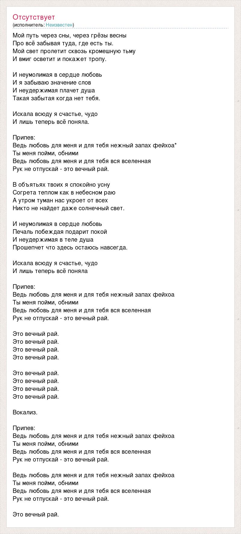 Мой путь через сны, через грёзы весны Про всё забывая туда, где есть ты. Мой свет пролетит сквозь кромешную тьму И вмиг осветит и покажет тропу. И неумолимая в сердце любовь И я забываю значение слов И неудержимая плачет душа Такая забытая когда нет тебя. Искала всюду я счастье, чудо И лишь теперь всё поняла. Припев: Ведь любовь для меня и для тебя нежный запах фейхоа* Ты меня пойми, обними Ведь любовь для меня и для тебя вся вселенная Рук не отпускай - это вечный рай. В объятьях твоих я спокойно усну Согрета теплом как в небесном раю А утром туман нас укроет от всех Никто не найдет даже солнечный свет. И неумолимая в сердце любовь Печаль побеждая подарит покой И неудержимая в теле душа Прошепчет что здесь остаюсь навсегда. Искала всюду я счастье, чудо И лишь теперь всё поняла Припев: Ведь любовь для меня и для тебя нежный запах фейхоа Ты меня пойми, обними Ведь любовь для меня и для тебя вся вселенная Рук не отпускай - это вечный рай. Это вечный рай. Это вечный рай. Это вечный рай. Это вечный рай. Это вечный рай. Это вечный рай. Это вечный рай. Это вечный рай. Вокализ. Припев: Ведь любовь для меня и для тебя нежный запах фейхоа Ты меня пойми, обними Ведь любовь для меня и для тебя вся вселенная Рук не отпускай - это вечный рай. Ведь любовь для меня и для тебя нежный запах фейхоа Ты меня пойми, обними Ведь любовь для меня и для тебя вся вселенная Рук не отпускай - это вечный рай. Это вечный рай.