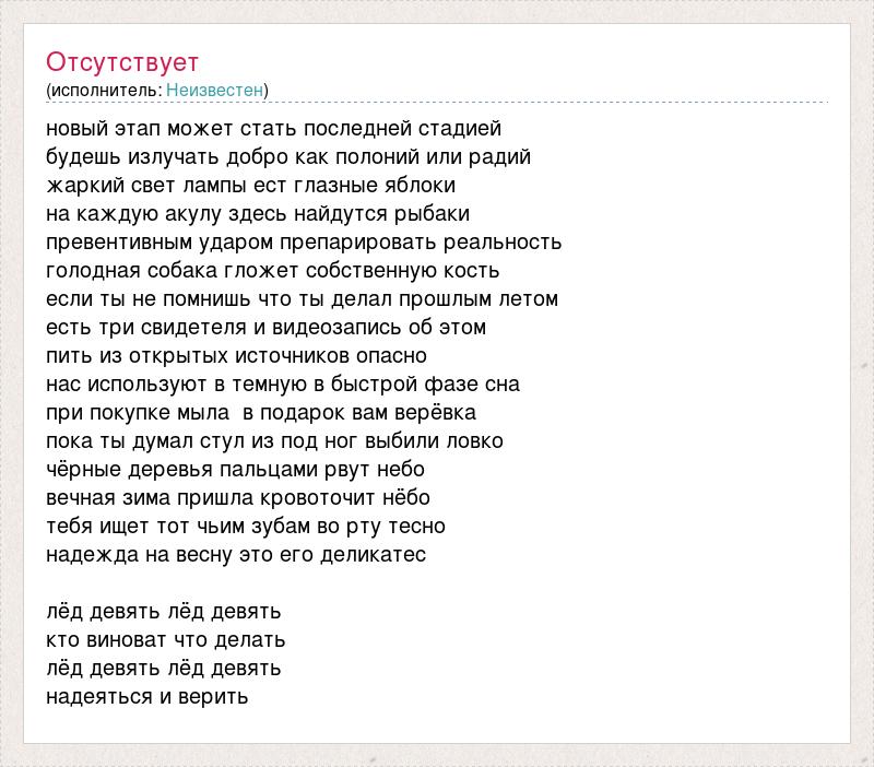новый этап может стать последней стадией будешь излучать добро как полоний или радий жаркий свет лампы ест глазные яблоки на каждую акулу здесь найдутся рыбаки превентивным ударом препарировать реальность голодная собака гложет собственную кость если ты не помнишь что ты делал прошлым летом есть три свидетеля и видеозапись об этом пить из открытых источников опасно нас используют в темную в быстрой фазе сна при покупке мыла в подарок вам верёвка пока ты думал стул из под ног выбили ловко чёрные деревья пальцами рвут небо вечная зима пришла кровоточит нёбо тебя ищет тот чьим зубам во рту тесно надежда на весну это его деликатес лёд девять лёд девять кто виноват что делать лёд девять лёд девять надеяться и верить