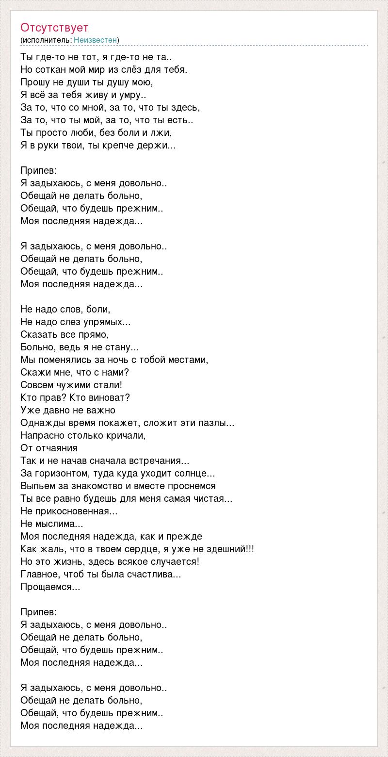 Ты где-то не тот, я где-то не та.. Но соткан мой мир из слёз для тебя. Прошу не души ты душу мою, Я всё за тебя живу и умру.. За то, что со мной, за то, что ты здесь, За то, что ты мой, за то, что ты есть.. Ты просто люби, без боли и лжи, Я в руки твои, ты крепче держи... Припев: Я задыхаюсь, с меня довольно.. Обещай не делать больно, Обещай, что будешь прежним.. Моя последняя надежда... Я задыхаюсь, с меня довольно.. Обещай не делать больно, Обещай, что будешь прежним.. Моя последняя надежда... Не надо слов, боли, Не надо слез упрямых... Сказать все прямо, Больно, ведь я не стану... Мы поменялись за ночь с тобой местами, Скажи мне, что с нами? Совсем чужими стали! Кто прав? Кто виноват? Уже давно не важно Однажды время покажет, сложит эти пазлы... Напрасно столько кричали, От отчаяния Так и не начав сначала встречания... За горизонтом, туда куда уходит солнце... Выпьем за знакомство и вместе проснемся Ты все равно будешь для меня самая чистая... Не прикосновенная... Не мыслима... Моя последняя надежда, как и прежде Как жаль, что в твоем сердце, я уже не здешний!!! Но это жизнь, здесь всякое случается! Главное, чтоб ты была счастлива... Прощаемся... Припев: Я задыхаюсь, с меня довольно.. Обещай не делать больно, Обещай, что будешь прежним.. Моя последняя надежда... Я задыхаюсь, с меня довольно.. Обещай не делать больно, Обещай, что будешь прежним.. Моя последняя надежда...