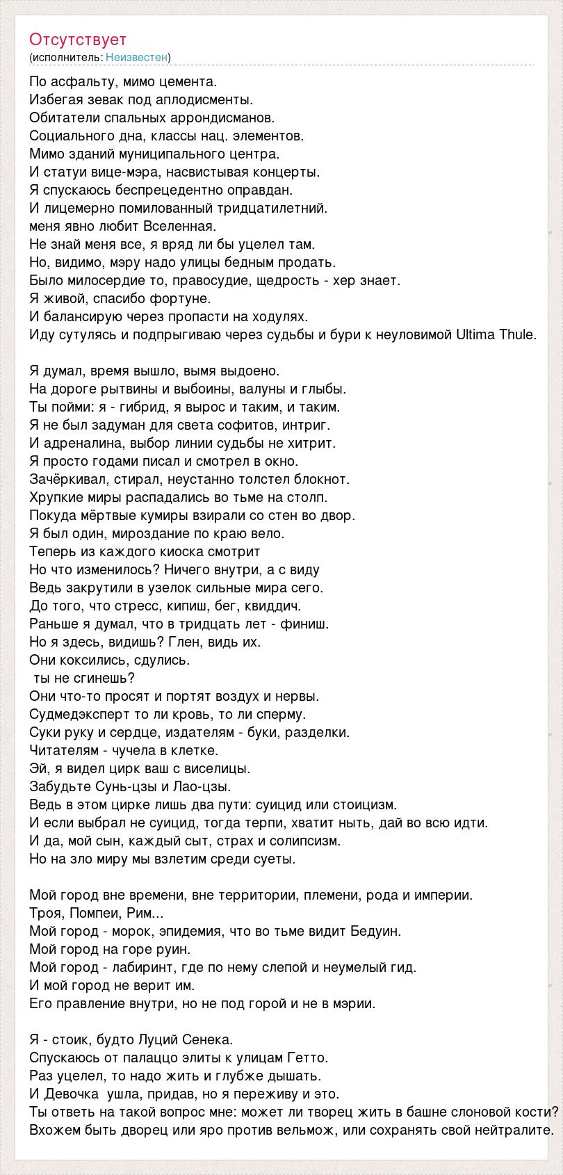 По асфальту, мимо цемента. Избегая зевак под аплодисменты. Обитатели спальных аррондисманов. Социального дна, классы нац. элементов. Мимо зданий муниципального центра. И статуи вице-мэра, насвистывая концерты. Я спускаюсь беспрецедентно оправдан. И лицемерно помилованный тридцатилетний. меня явно любит Вселенная. Не знай меня все, я вряд ли бы уцелел там. Но, видимо, мэру надо улицы бедным продать. Было милосердие то, правосудие, щедрость - хер знает. Я живой, спасибо фортуне. И балансирую через пропасти на ходулях. Иду сутулясь и подпрыгиваю через судьбы и бури к неуловимой Ultima Thule. Я думал, время вышло, вымя выдоено. На дороге рытвины и выбоины, валуны и глыбы. Ты пойми: я - гибрид, я вырос и таким, и таким. Я не был задуман для света софитов, интриг. И адреналина, выбор линии судьбы не хитрит. Я просто годами писал и смотрел в окно. Зачёркивал, стирал, неустанно толстел блокнот. Хрупкие миры распадались во тьме на столп. Покуда мёртвые кумиры взирали со стен во двор. Я был один, мироздание по краю вело. Теперь из каждого киоска смотрит Но что изменилось? Ничего внутри, а с виду Ведь закрутили в узелок сильные мира сего. До того, что стресс, кипиш, бег, квиддич. Раньше я думал, что в тридцать лет - финиш. Но я здесь, видишь? Глен, видь их. Они коксились, сдулись. ты не сгинешь? Они что-то просят и портят воздух и нервы. Судмедэксперт то ли кровь, то ли сперму. Суки руку и сердце, издателям - буки, разделки. Читателям - чучела в клетке. Эй, я видел цирк ваш с виселицы. Забудьте Сунь-цзы и Лао-цзы. Ведь в этом цирке лишь два пути: суицид или стоицизм. И если выбрал не суицид, тогда терпи, хватит ныть, дай во всю идти. И да, мой сын, каждый сыт, страх и солипсизм. Но на зло миру мы взлетим среди суеты. Мой город вне времени, вне территории, племени, рода и империи. Троя, Помпеи, Рим... Мой город - морок, эпидемия, что во тьме видит Бедуин. Мой город на горе руин. Мой город - лабиринт, где по нему слепой и неумелый гид. И мой город не верит им. Его правление внутри, но не под горой и не в мэрии. Я - стоик, будто Луций Сенека. Спускаюсь от палаццо элиты к улицам Гетто. Раз уцелел, то надо жить и глубже дышать. И Девочка ушла, придав, но я переживу и это. Ты ответь на такой вопрос мне: может ли творец жить в башне слоновой кости? Вхожем быть дворец или яро против вельмож, или сохранять свой нейтралите.