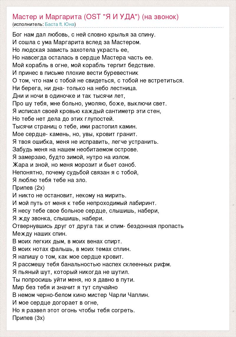 Бог нам дал любовь, с ней словно крылья за спину. И сошла с ума Маргарита вслед за Мастером. Но людская зависть захотела украсть ее, Но навсегда осталась в сердце Мастера часть ее. Мой корабль в огне, мой корабль терпит бедствие. И принес в письме плохие вести буревестник О том, что нам с тобой не свидеться, с тобой не встретиться. Ни берега, ни дна- только на небо лестница. Дни и ночи в одиночке и так тысячи лет, Про шу тебя, мне больно, умоляю, боже, выключи свет. Я исписал своей кровью каждый сантиметр эти стен, Но тебе нет дела до этих глупостей. Тысячи страниц о тебе, ими растопил камин. Мое сердце- камень, но, увы, кровит гранит. Я твоя ошибка, меня не исправить, легче устранить. Забудь меня на нашем необитаемом острове. Я замерзаю, будто зимой, нутро на излом. Жара и зной, но меня морозит и бьет озноб. Непонятно, почему судьбой связан я с тобой, Я люблю тебя тебе на зло. Припев (2x) И никто не остановит, некому на мирить. И мой путь от меня к тебе непроходимый лабиринт. Я несу тебе свое больное сердце, слышишь, набери, Я жду звонка, слышишь, набери. Отвернувшись друг от друга так и спим- бездонная пропасть Между наших спин. В моих легких дым, в моих венах спирт. В моих нотах фальшь, в моих темах сплин. Я напишу о том, как мое сердце кровит. Я рассмешу тебя банальностью наспех склеенных рифм. Я пьяный шут, который никогда не шутил. Ты попросишь уйти меня, но я давно в пути. Мир без тебя и значит я тут случайно В немом черно-белом кино мистер Чарли Чаплин. И мое сердце догорает в огне, Но я развел этот огонь чтобы тебя согреть. Припев (3x)