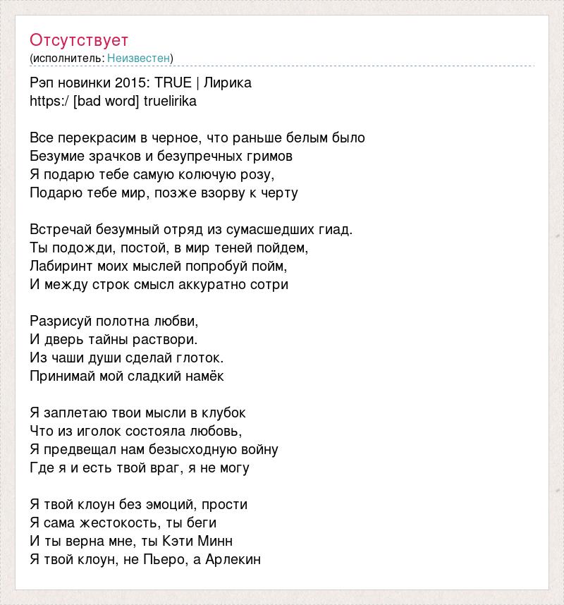 Рэп новинки 2015: TRUE | Лирика https:/ [bad word] truelirika Все перекрасим в черное, что раньше белым было Безумие зрачков и безупречных гримов Я подарю тебе самую колючую розу, Подарю тебе мир, позже взорву к черту Встречай безумный отряд из сумасшедших гиад. Ты подожди, постой, в мир теней пойдем, Лабиринт моих мыслей попробуй пойм, И между строк смысл аккуратно сотри Разрисуй полотна любви, И дверь тайны раствори. Из чаши души сделай глоток. Принимай мой сладкий намёк Я заплетаю твои мысли в клубок Что из иголок состояла любовь, Я предвещал нам безысходную войну Где я и есть твой враг, я не могу Я твой клоун без эмоций, прости Я сама жестокость, ты беги И ты верна мне, ты Кэти Минн Я твой клоун, не Пьеро, а Арлекин