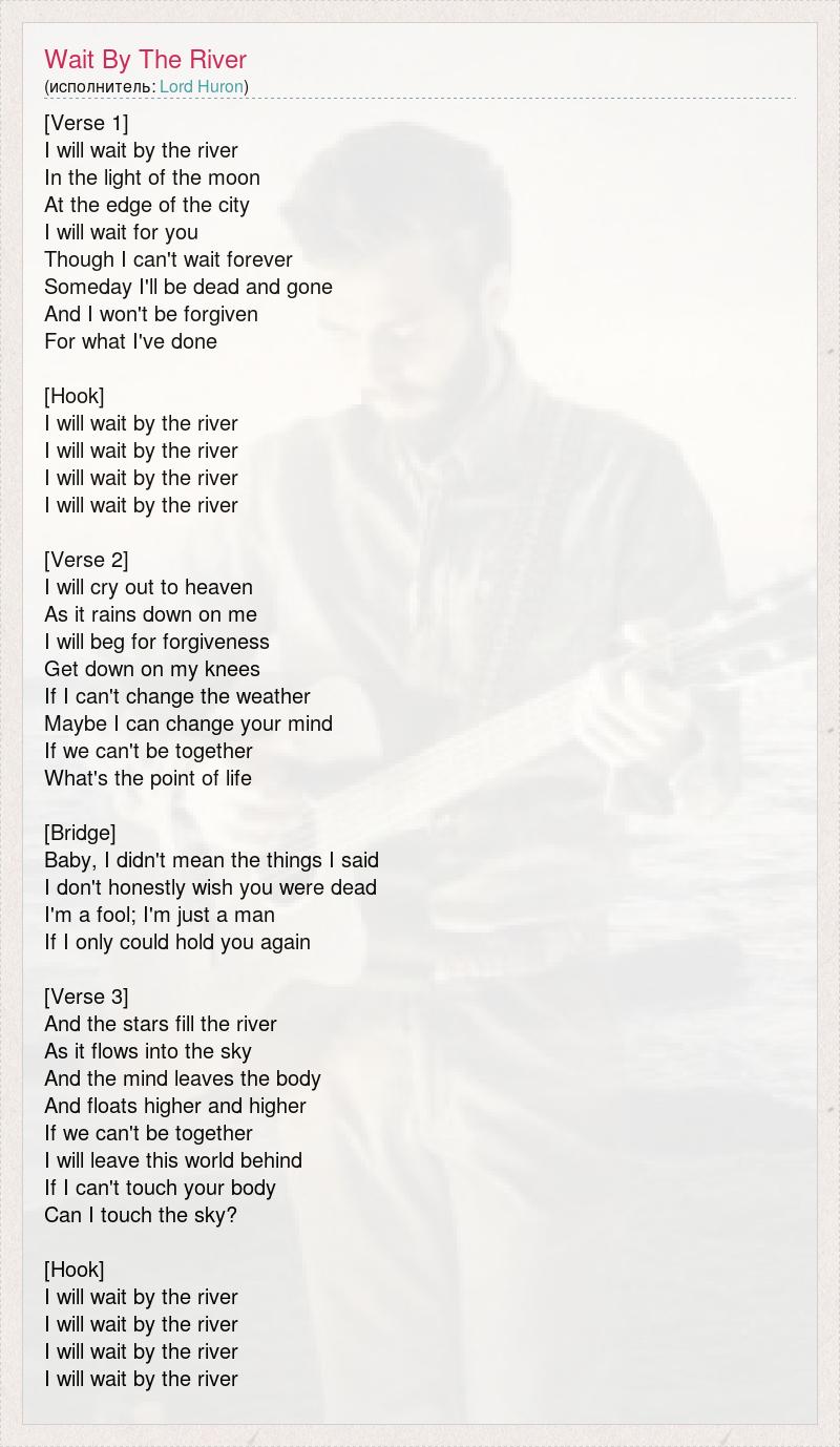 [Verse 1] I will wait by the river In the light of the moon At the edge of the city I will wait for you Though I can't wait forever Someday I'll be dead and gone And I won't be forgiven For what I've done [Hook] I will wait by the river I will wait by the river I will wait by the river I will wait by the river [Verse 2] I will cry out to heaven As it rains down on me I will beg for forgiveness Get down on my knees If I can't change the weather Maybe I can change your mind If we can't be together What's the point of life [Bridge] Baby, I didn't mean the things I said I don't honestly wish you were dead I'm a fool; I'm just a man If I only could hold you again [Verse 3] And the stars fill the river As it flows into the sky And the mind leaves the body And floats higher and higher If we can't be together I will leave this world behind If I can't touch your body Can I touch the sky? [Hook] I will wait by the river I will wait by the river I will wait by the river I will wait by the river
