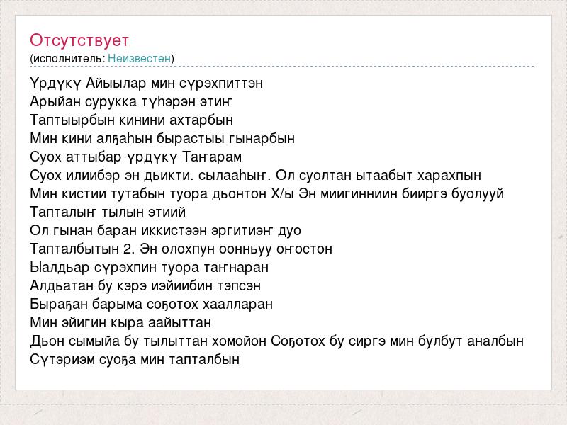 Yрдүкү Айыылар мин сүрэхпиттэн Арыйан сурукка түhэрэн этиҥ Таптыырбын кинини ахтарбын Мин кини алҕаhын бырастыы гынарбын Суох аттыбар үрдүкү Таҥарам Суох илиибэр эн дьикти. сылааhыҥ. Ол суолтан ытаабыт харахпын Мин кистии тутабын туора дьонтон Х/ы Эн миигинниин бииргэ буолууй Тапталыҥ тылын этиий Ол гынан баран иккистээн эргитиэҥ дуо Тапталбытын 2. Эн олохпун оонньуу оҥостон Ыалдьар сүрэхпин туора таҥнаран Алдьатан бу кэрэ иэйиибин тэпсэн Быраҕан барыма соҕотох хаалларан Мин эйигин кыра аайыттан Дьон сымыйа бу тылыттан хомойон Соҕотох бу сиргэ мин булбут аналбын Сүтэриэм суоҕа мин тапталбын
