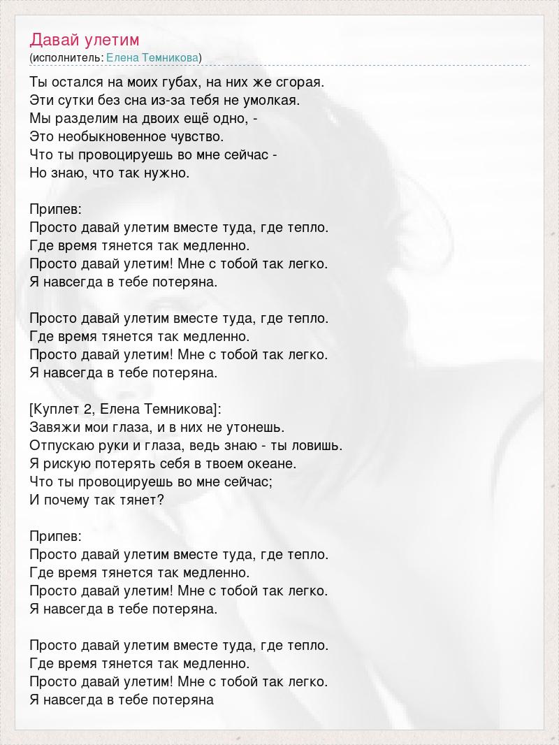 Ты остался на моих губах, на них же сгорая. Эти сутки без сна из-за тебя не умолкая. Мы разделим на двоих ещё одно, - Это необыкновенное чувство. Что ты провоцируешь во мне сейчас - Но знаю, что так нужно. Припев: Просто давай улетим вместе туда, где тепло. Где время тянется так медленно. Просто давай улетим! Мне с тобой так легко. Я навсегда в тебе потеряна. Просто давай улетим вместе туда, где тепло. Где время тянется так медленно. Просто давай улетим! Мне с тобой так легко. Я навсегда в тебе потеряна. [Куплет 2, Елена Темникова]: Завяжи мои глаза, и в них не утонешь. Отпускаю руки и глаза, ведь знаю - ты ловишь. Я рискую потерять себя в твоем океане. Что ты провоцируешь во мне сейчас; И почему так тянет? Припев: Просто давай улетим вместе туда, где тепло. Где время тянется так медленно. Просто давай улетим! Мне с тобой так легко. Я навсегда в тебе потеряна. Просто давай улетим вместе туда, где тепло. Где время тянется так медленно. Просто давай улетим! Мне с тобой так легко. Я навсегда в тебе потеряна
