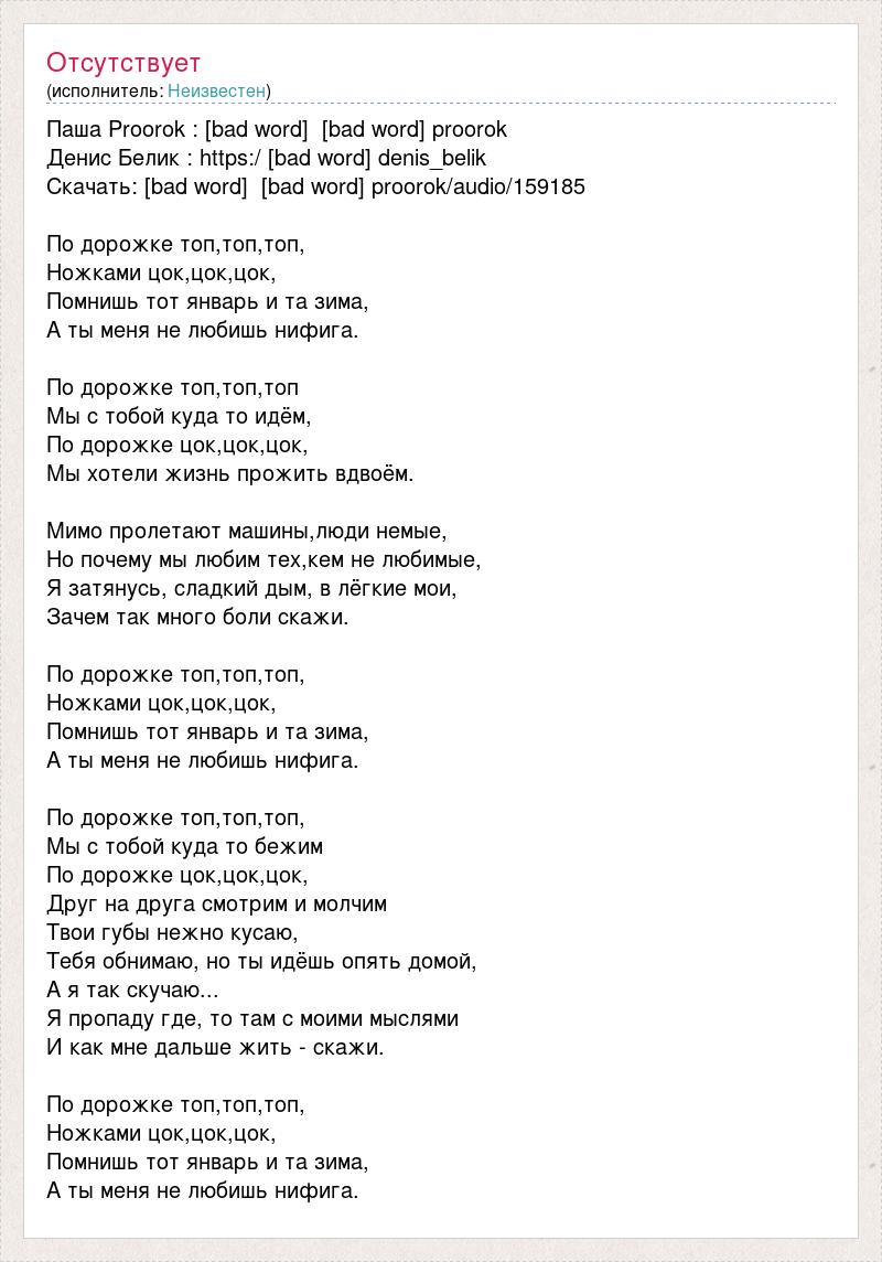 Паша Proorok : [bad word] [bad word] proorok Денис Белик : https:/ [bad word] denis_belik Скачать: [bad word] [bad word] proorok/audio/159185 По дорожке топ,топ,топ, Ножками цок,цок,цок, Помнишь тот январь и та зима, А ты меня не любишь нифига. По дорожке топ,топ,топ Мы с тобой куда то идём, По дорожке цок,цок,цок, Мы хотели жизнь прожить вдвоём. Мимо пролетают машины,люди немые, Но почему мы любим тех,кем не любимые, Я затянусь, сладкий дым, в лёгкие мои, Зачем так много боли скажи. По дорожке топ,топ,топ, Ножками цок,цок,цок, Помнишь тот январь и та зима, А ты меня не любишь нифига. По дорожке топ,топ,топ, Мы с тобой куда то бежим По дорожке цок,цок,цок, Друг на друга смотрим и молчим Твои губы нежно кусаю, Тебя обнимаю, но ты идёшь опять домой, А я так скучаю... Я пропаду где, то там с моими мыслями И как мне дальше жить - скажи. По дорожке топ,топ,топ, Ножками цок,цок,цок, Помнишь тот январь и та зима, А ты меня не любишь нифига.