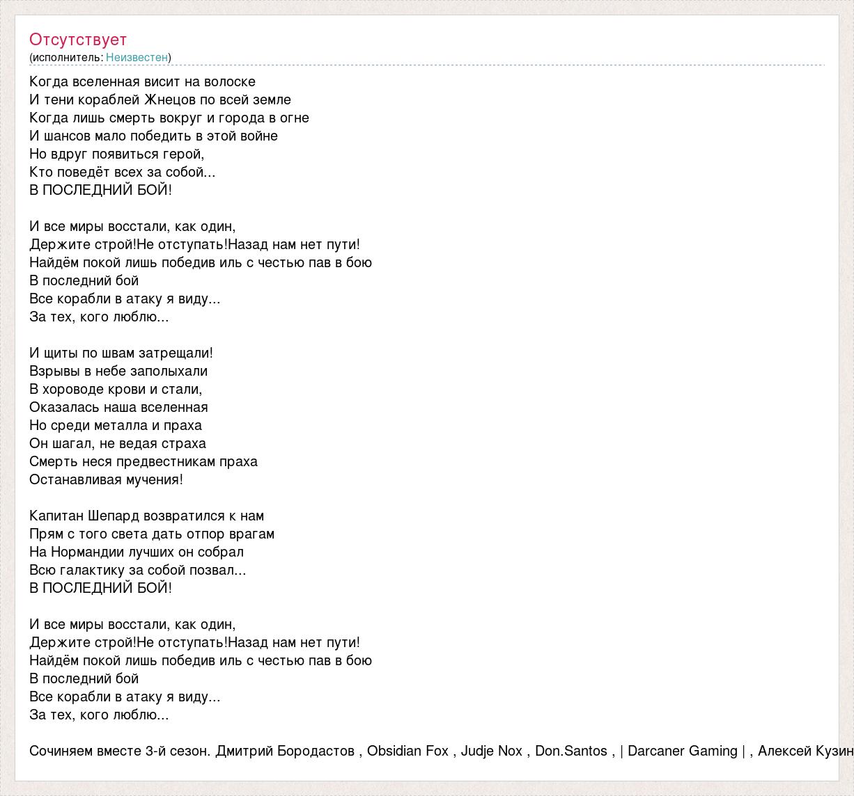 Когда вселенная висит на волоске И тени кораблей Жнецов по всей земле Когда лишь смерть вокруг и города в огне И шансов мало победить в этой войне Но вдруг появиться герой, Кто поведёт всех за собой... В ПОСЛЕДНИЙ БОЙ! И все миры восстали, как один, Держите строй!Не отступать!Назад нам нет пути! Найдём покой лишь победив иль с честью пав в бою В последний бой Все корабли в атаку я виду... За тех, кого люблю... И щиты по швам затрещали! Взрывы в небе заполыхали В хороводе крови и стали, Оказалась наша вселенная Но среди металла и праха Он шагал, не ведая страха Смерть неся предвестникам праха Останавливая мучения! Капитан Шепард возвратился к нам Прям с того света дать отпор врагам На Нормандии лучших он собрал Всю галактику за собой позвал... В ПОСЛЕДНИЙ БОЙ! И все миры восстали, как один, Держите строй!Не отступать!Назад нам нет пути! Найдём покой лишь победив иль с честью пав в бою В последний бой Все корабли в атаку я виду... За тех, кого люблю... Сочиняем вместе 3-й сезон. Дмитрий Бородастов , Obsidian Fox , Judje Nox , Don.Santos , | Darcaner Gaming | , Алексей Кузин