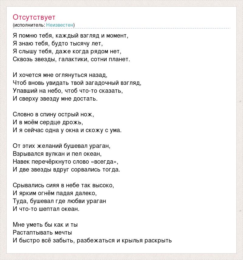 Я помню тебя, каждый взгляд и момент, Я знаю тебя, будто тысячу лет, Я слышу тебя, даже когда рядом нет, Сквозь звезды, галактики, сотни планет. И хочется мне оглянуться назад, Чтоб вновь увидать твой загадочный взгляд, Упавший на небо, чтоб что-то сказать, И сверху звезду мне достать. Словно в спину острый нож, И в моём сердце дрожь, И я сейчас одна у окна и скожу с ума. От этих желаний бушевал ураган, Взрывался вулкан и пел океан, Навек перечёркнуто слово «всегда», И две звезды вдруг сорвались тогда. Срывались сияя в небе так высоко, И ярким огнём падая далеко, Туда, бушевал где любви ураган И что-то шептал океан. Мне уметь бы как и ты Растаптывать мечты И быстро всё забыть, разбежаться и крылья раскрыть
