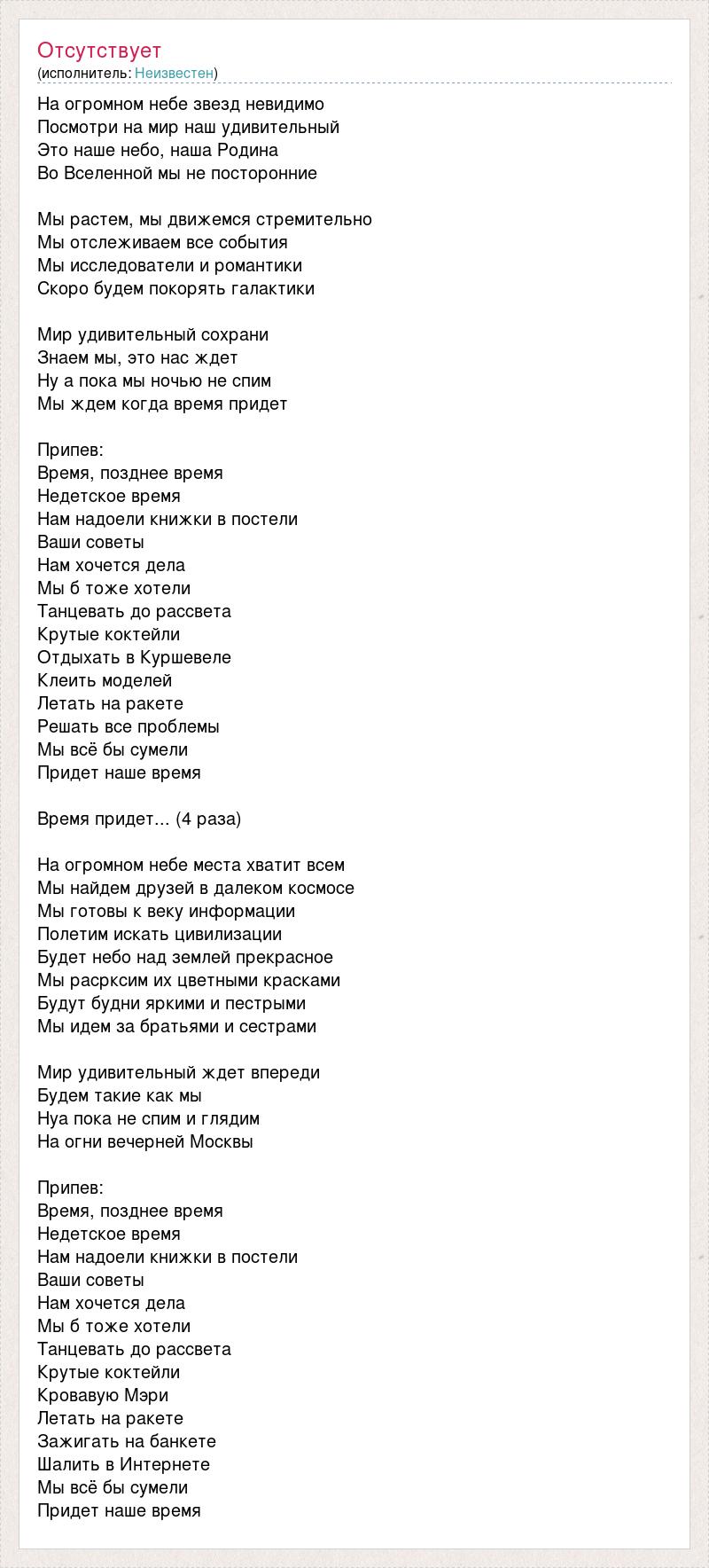 На огромном небе звезд невидимо Посмотри на мир наш удивительный Это наше небо, наша Родина Во Вселенной мы не посторонние Мы растем, мы движемся стремительно Мы отслеживаем все события Мы исследователи и романтики Скоро будем покорять галактики Мир удивительный сохрани Знаем мы, это нас ждет Ну а пока мы ночью не спим Мы ждем когда время придет Припев: Время, позднее время Недетское время Нам надоели книжки в постели Ваши советы Нам хочется дела Мы б тоже хотели Танцевать до рассвета Крутые коктейли Отдыхать в Куршевеле Клеить моделей Летать на ракете Решать все проблемы Мы всё бы сумели Придет наше время Время придет... (4 раза) На огромном небе места хватит всем Мы найдем друзей в далеком космосе Мы готовы к веку информации Полетим искать цивилизации Будет небо над землей прекрасное Мы расрксим их цветными красками Будут будни яркими и пестрыми Мы идем за братьями и сестрами Мир удивительный ждет впереди Будем такие как мы Нуа пока не спим и глядим На огни вечерней Москвы Припев: Время, позднее время Недетское время Нам надоели книжки в постели Ваши советы Нам хочется дела Мы б тоже хотели Танцевать до рассвета Крутые коктейли Кровавую Мэри Летать на ракете Зажигать на банкете Шалить в Интернете Мы всё бы сумели Придет наше время