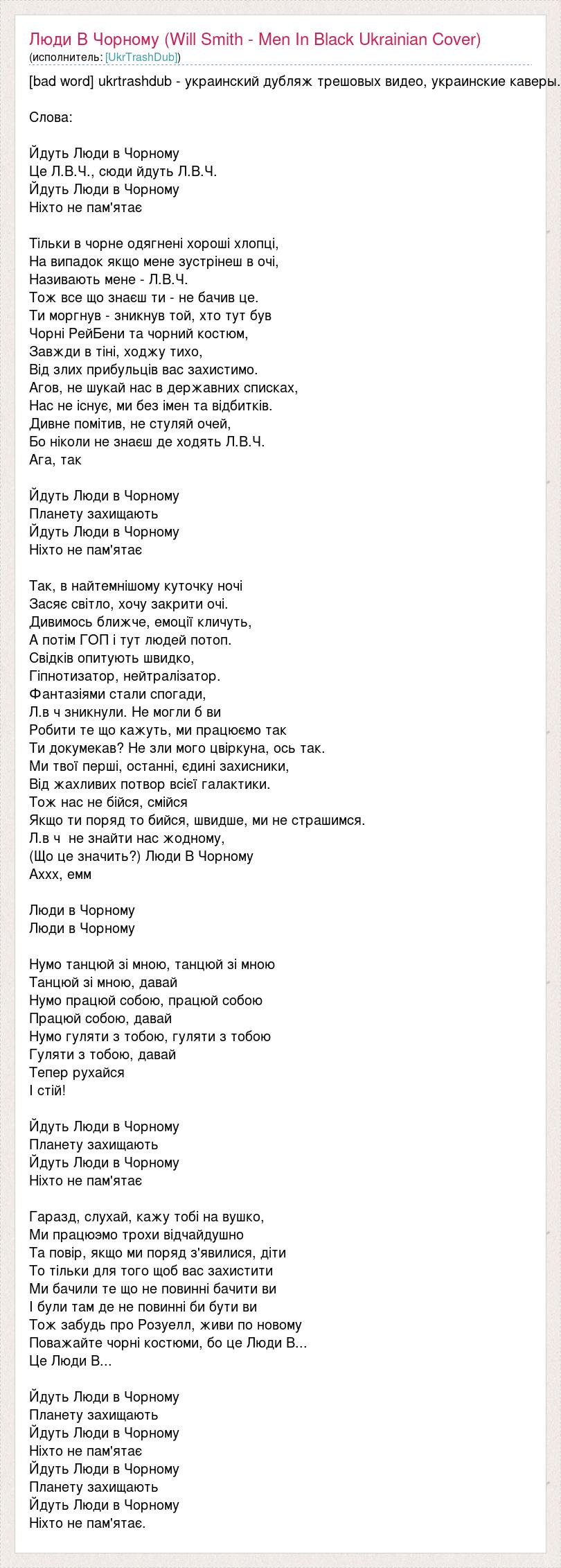 [bad word] ukrtrashdub - украинский дубляж трешовых видео, украинские каверы. Cлова: Йдуть Люди в Чорному Це Л.В.Ч., сюди йдуть Л.В.Ч. Йдуть Люди в Чорному Ніхто не пам'ятає Тільки в чорне одягнені хороші хлопці, На випадок якщо мене зустрінеш в очі, Називають мене - Л.В.Ч. Тож все що знаєш ти - не бачив це. Ти моргнув - зникнув той, хто тут був Чорні РейБени та чорний костюм, Завжди в тіні, ходжу тихо, Від злих прибульців вас захистимо. Агов, не шукай нас в державних списках, Нас не існує, ми без імен та відбитків. Дивне помітив, не стуляй очей, Бо ніколи не знаєш де ходять Л.В.Ч. Ага, так Йдуть Люди в Чорному Планету захищають Йдуть Люди в Чорному Ніхто не пам'ятає Так, в найтемнішому куточку ночі Засяє світло, хочу закрити очі. Дивимось ближче, емоції кличуть, А потім ГОП і тут людей потоп. Свідків опитують швидко, Гіпнотизатор, нейтралізатор. Фантазіями стали спогади, Л.в ч зникнули. Не могли б ви Робити те що кажуть, ми працюємо так Ти докумекав? Не зли мого цвіркуна, ось так. Ми твої перші, останні, єдині захисники, Від жахливих потвор всієї галактики. Тож нас не бійся, смійся Якщо ти поряд то бийся, швидше, ми не страшимся. Л.в ч не знайти нас жодному, (Що це значить?) Люди В Чорному Аххх, емм Люди в Чорному Люди в Чорному Нумо танцюй зі мною, танцюй зі мною Танцюй зі мною, давай Нумо працюй собою, працюй собою Працюй собою, давай Нумо гуляти з тобою, гуляти з тобою Гуляти з тобою, давай Тепер рухайся І стій! Йдуть Люди в Чорному Планету захищають Йдуть Люди в Чорному Ніхто не пам'ятає Гаразд, слухай, кажу тобі на вушко, Ми працюэмо трохи відчайдушно Та повір, якщо ми поряд з'явилися, діти То тільки для того щоб вас захистити Ми бачили те що не повинні бачити ви І були там де не повинні би бути ви Тож забудь про Розуелл, живи по новому Поважайте чорні костюми, бо це Люди В... Це Люди В... Йдуть Люди в Чорному Планету захищають Йдуть Люди в Чорному Ніхто не пам'ятає Йдуть Люди в Чорному Планету захищають Йдуть Люди в Чорному Ніхто не пам'ятає.
