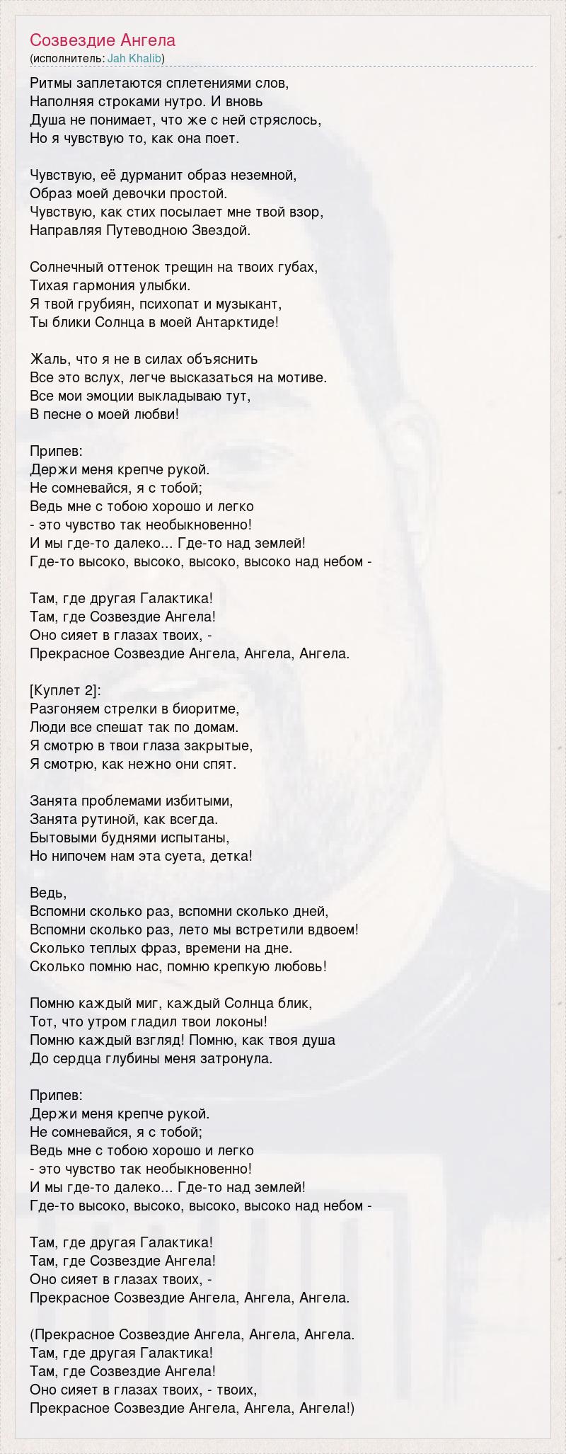 Ритмы заплетаются сплетениями слов, Наполняя строками нутро. И вновь Душа не понимает, что же с ней стряслось, Но я чувствую то, как она поет. Чувствую, её дурманит образ неземной, Образ моей девочки простой. Чувствую, как стих посылает мне твой взор, Направляя Путеводною Звездой. Солнечный оттенок трещин на твоих губах, Тихая гармония улыбки. Я твой грубиян, психопат и музыкант, Ты блики Солнца в моей Антарктиде! Жаль, что я не в силах объяснить Все это вслух, легче высказаться на мотиве. Все мои эмоции выкладываю тут, В песне о моей любви! Припев: Держи меня крепче рукой. Не сомневайся, я с тобой; Ведь мне с тобою хорошо и легко - это чувство так необыкновенно! И мы где-то далеко... Где-то над землей! Где-то высоко, высоко, высоко, высоко над небом - Там, где другая Галактика! Там, где Созвездие Ангела! Оно сияет в глазах твоих, - Прекрасное Созвездие Ангела, Ангела, Ангела. [Куплет 2]: Разгоняем стрелки в биоритме, Люди все спешат так по домам. Я смотрю в твои глаза закрытые, Я смотрю, как нежно они спят. Занята проблемами избитыми, Занята рутиной, как всегда. Бытовыми буднями испытаны, Но нипочем нам эта суета, детка! Ведь, Вспомни сколько раз, вспомни сколько дней, Вспомни сколько раз, лето мы встретили вдвоем! Сколько теплых фраз, времени на дне. Сколько помню нас, помню крепкую любовь! Помню каждый миг, каждый Солнца блик, Тот, что утром гладил твои локоны! Помню каждый взгляд! Помню, как твоя душа До сердца глубины меня затронула. Припев: Держи меня крепче рукой. Не сомневайся, я с тобой; Ведь мне с тобою хорошо и легко - это чувство так необыкновенно! И мы где-то далеко... Где-то над землей! Где-то высоко, высоко, высоко, высоко над небом - Там, где другая Галактика! Там, где Созвездие Ангела! Оно сияет в глазах твоих, - Прекрасное Созвездие Ангела, Ангела, Ангела. (Прекрасное Созвездие Ангела, Ангела, Ангела. Там, где другая Галактика! Там, где Созвездие Ангела! Оно сияет в глазах твоих, - твоих, Прекрасное Созвездие Ангела, Ангела, Ангела!)