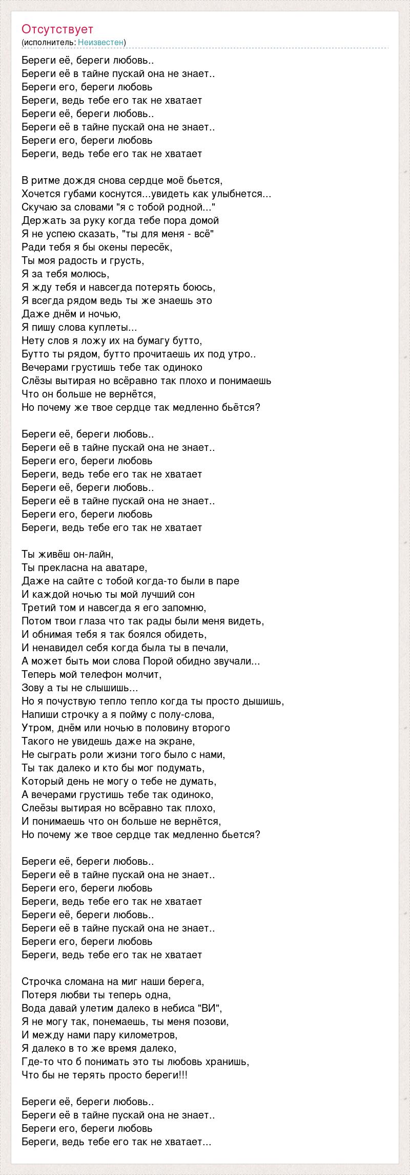 Береги её, береги любовь.. Береги её в тайне пускай она не знает.. Береги его, береги любовь Береги, ведь тебе его так не хватает Береги её, береги любовь.. Береги её в тайне пускай она не знает.. Береги его, береги любовь Береги, ведь тебе его так не хватает В ритме дождя снова сердце моё бьется, Хочется губами коснутся...увидеть как улыбнется... Скучаю за словами "я с тобой родной..." Держать за руку когда тебе пора домой Я не успею сказать, "ты для меня - всё" Ради тебя я бы окены пересёк, Ты моя радость и грусть, Я за тебя молюсь, Я жду тебя и навсегда потерять боюсь, Я всегда рядом ведь ты же знаешь это Даже днём и ночью, Я пишу слова куплеты... Нету слов я ложу их на бумагу бутто, Бутто ты рядом, бутто прочитаешь их под утро.. Вечерами грустишь тебе так одиноко Слёзы вытирая но всёравно так плохо и понимаешь Что он больше не вернётся, Но почему же твое сердце так медленно бьётся? Береги её, береги любовь.. Береги её в тайне пускай она не знает.. Береги его, береги любовь Береги, ведь тебе его так не хватает Береги её, береги любовь.. Береги её в тайне пускай она не знает.. Береги его, береги любовь Береги, ведь тебе его так не хватает Ты живёш он-лайн, Ты прекласна на аватаре, Даже на сайте с тобой когда-то были в паре И каждой ночью ты мой лучший сон Третий том и навсегда я его запомню, Потом твои глаза что так рады были меня видеть, И обнимая тебя я так боялся обидеть, И ненавидел себя когда была ты в печали, А может быть мои слова Порой обидно звучали... Теперь мой телефон молчит, Зову а ты не слышишь... Но я почуствую тепло тепло когда ты просто дышишь, Напиши строчку а я пойму с полу-слова, Утром, днём или ночью в половину второго Такого не увидешь даже на экране, Не сыграть роли жизни того было с нами, Ты так далеко и кто бы мог подумать, Который день не могу о тебе не думать, А вечерами грустишь тебе так одиноко, Слеёзы вытирая но всёравно так плохо, И понимаешь что он больше не вернётся, Но почему же твое сердце так медленно бьется? Береги её, береги любовь.. Береги её в тайне пускай она не знает.. Береги его, береги любовь Береги, ведь тебе его так не хватает Береги её, береги любовь.. Береги её в тайне пускай она не знает.. Береги его, береги любовь Береги, ведь тебе его так не хватает Строчка сломана на миг наши берега, Потеря любви ты теперь одна, Вода давай улетим далеко в небиса "ВИ", Я не могу так, понемаешь, ты меня позови, И между нами пару километров, Я далеко в то же время далеко, Где-то что б понимать это ты любовь хранишь, Что бы не терять просто береги!!! Береги её, береги любовь.. Береги её в тайне пускай она не знает.. Береги его, береги любовь Береги, ведь тебе его так не хватает...
