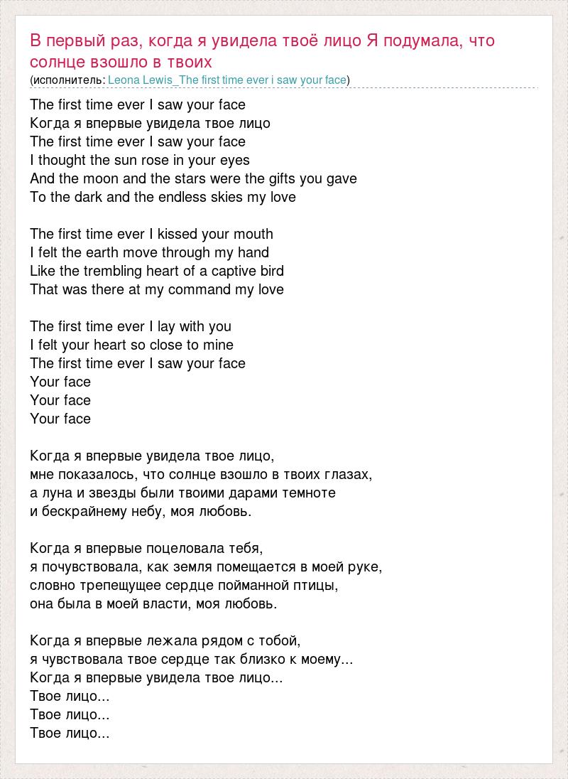 The first time ever I saw your face Когда я впервые увидела твое лицо The first time ever I saw your face I thought the sun rose in your eyes And the moon and the stars were the gifts you gave To the dark and the endless skies my love The first time ever I kissed your mouth I felt the earth move through my hand Like the trembling heart of a captive bird That was there at my command my love The first time ever I lay with you I felt your heart so close to mine The first time ever I saw your face Your face Your face Your face Когда я впервые увидела твое лицо, мне показалось, что солнце взошло в твоих глазах, а луна и звезды были твоими дарами темноте и бескрайнему небу, моя любовь. Когда я впервые поцеловала тебя, я почувствовала, как земля помещается в моей руке, словно трепещущее сердце пойманной птицы, она была в моей власти, моя любовь. Когда я впервые лежала рядом с тобой, я чувствовала твое сердце так близко к моему... Когда я впервые увидела твое лицо... Твое лицо... Твое лицо... Твое лицо...