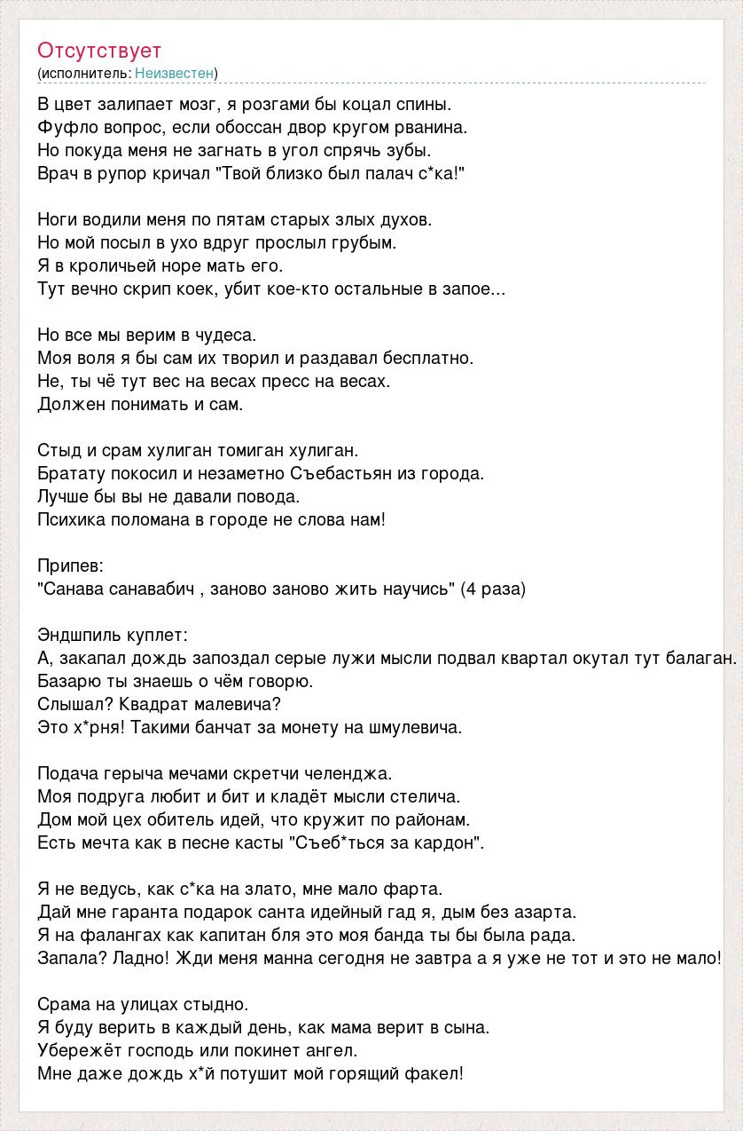 В цвет залипает мозг, я розгами бы коцал спины. Фуфло вопрос, если обоссан двор кругом рванина. Но покуда меня не загнать в угол спрячь зубы. Врач в рупор кричал "Твой близко был палач с*ка!" Ноги водили меня по пятам старых злых духов. Но мой посыл в ухо вдруг прослыл грубым. Я в кроличьей норе мать его. Тут вечно скрип коек, убит кое-кто остальные в запое... Но все мы верим в чудеса. Моя воля я бы сам их творил и раздавал бесплатно. Не, ты чё тут вес на весах пресс на весах. Должен понимать и сам. Стыд и срам хулиган томиган хулиган. Братату покосил и незаметно Съебастьян из города. Лучше бы вы не давали повода. Психика поломана в городе не слова нам! Припев: "Санава санавабич , заново заново жить научись" (4 раза) Эндшпиль куплет: А, закапал дождь запоздал серые лужи мысли подвал квартал окутал тут балаган. Базарю ты знаешь о чём говорю. Слышал? Квадрат малевича? Это х*рня! Такими банчат за монету на шмулевича. Подача герыча мечами скретчи челенджа. Моя подруга любит и бит и кладёт мысли стелича. Дом мой цех обитель идей, что кружит по районам. Есть мечта как в песне касты "Съеб*ться за кардон". Я не ведусь, как с*ка на злато, мне мало фарта. Дай мне гаранта подарок санта идейный гад я, дым без азарта. Я на фалангах как капитан бля это моя банда ты бы была рада. Запала? Ладно! Жди меня манна сегодня не завтра а я уже не тот и это не мало! Срама на улицах стыдно. Я буду верить в каждый день, как мама верит в сына. Убережёт господь или покинет ангел. Мне даже дождь х*й потушит мой горящий факел!