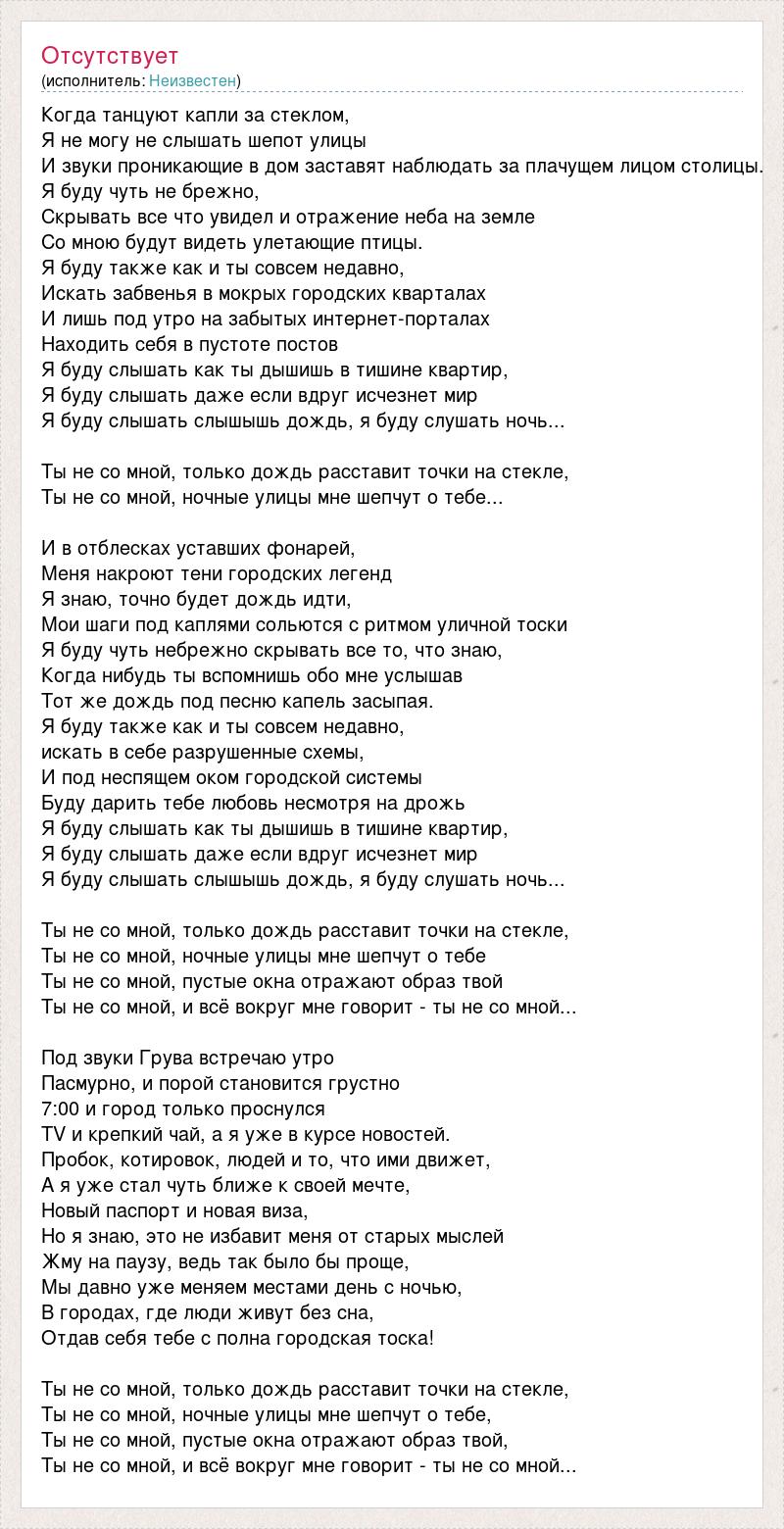 Когда танцуют капли за стеклом, Я не могу не слышать шепот улицы И звуки проникающие в дом заставят наблюдать за плачущем лицом столицы. Я буду чуть не брежно, Скрывать все что увидел и отражение неба на земле Со мною будут видеть улетающие птицы. Я буду также как и ты совсем недавно, Искать забвенья в мокрых городских кварталах И лишь под утро на забытых интернет-порталах Находить себя в пустоте постов Я буду слышать как ты дышишь в тишине квартир, Я буду слышать даже если вдруг исчезнет мир Я буду слышать слышышь дождь, я буду слушать ночь... Ты не со мной, только дождь расставит точки на стекле, Ты не со мной, ночные улицы мне шепчут о тебе... И в отблесках уставших фонарей, Меня накроют тени городских легенд Я знаю, точно будет дождь идти, Мои шаги под каплями сольются с ритмом уличной тоски Я буду чуть небрежно скрывать все то, что знаю, Когда нибудь ты вспомнишь обо мне услышав Тот же дождь под песню капель засыпая. Я буду также как и ты совсем недавно, искать в себе разрушенные схемы, И под неспящем оком городской системы Буду дарить тебе любовь несмотря на дрожь Я буду слышать как ты дышишь в тишине квартир, Я буду слышать даже если вдруг исчезнет мир Я буду слышать слышышь дождь, я буду слушать ночь... Ты не со мной, только дождь расставит точки на стекле, Ты не со мной, ночные улицы мне шепчут о тебе Ты не со мной, пустые окна отражают образ твой Ты не со мной, и всё вокруг мне говорит - ты не со мной... Под звуки Грува встречаю утро Пасмурно, и порой становится грустно 7:00 и город только проснулся TV и крепкий чай, а я уже в курсе новостей. Пробок, котировок, людей и то, что ими движет, А я уже стал чуть ближе к своей мечте, Новый паспорт и новая виза, Но я знаю, это не избавит меня от старых мыслей Жму на паузу, ведь так было бы проще, Мы давно уже меняем местами день с ночью, В городах, где люди живут без сна, Отдав себя тебе с полна городская тоска! Ты не со мной, только дождь расставит точки на стекле, Ты не со мной, ночные улицы мне шепчут о тебе, Ты не со мной, пустые окна отражают образ твой, Ты не со мной, и всё вокруг мне говорит - ты не со мной...