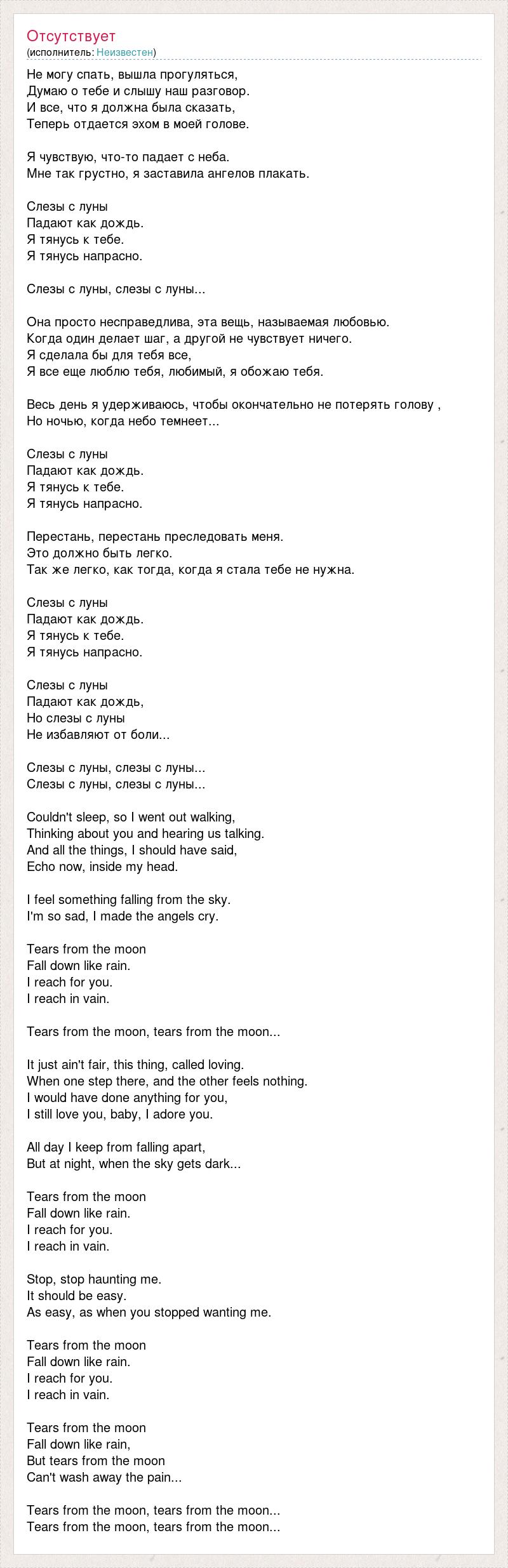 Не могу спать, вышла прогуляться, Думаю о тебе и слышу наш разговор. И все, что я должна была сказать, Теперь отдается эхом в моей голове. Я чувствую, что-то падает с неба. Мне так грустно, я заставила ангелов плакать. Слезы с луны Падают как дождь. Я тянусь к тебе. Я тянусь напрасно. Слезы с луны, слезы с луны... Она просто несправедлива, эта вещь, называемая любовью. Когда один делает шаг, а другой не чувствует ничего. Я сделала бы для тебя все, Я все еще люблю тебя, любимый, я обожаю тебя. Весь день я удерживаюсь, чтобы окончательно не потерять голову , Но ночью, когда небо темнеет... Слезы с луны Падают как дождь. Я тянусь к тебе. Я тянусь напрасно. Перестань, перестань преследовать меня. Это должно быть легко. Так же легко, как тогда, когда я стала тебе не нужна. Слезы с луны Падают как дождь. Я тянусь к тебе. Я тянусь напрасно. Слезы с луны Падают как дождь, Но слезы с луны Не избавляют от боли... Слезы с луны, слезы с луны... Слезы с луны, слезы с луны... Couldn't sleep, so I went out walking, Thinking about you and hearing us talking. And all the things, I should have said, Echo now, inside my head. I feel something falling from the sky. I'm so sad, I made the angels cry. Tears from the moon Fall down like rain. I reach for you. I reach in vain. Tears from the moon, tears from the moon... It just ain't fair, this thing, called loving. When one step there, and the other feels nothing. I would have done anything for you, I still love you, baby, I adore you. All day I keep from falling apart, But at night, when the sky gets dark... Tears from the moon Fall down like rain. I reach for you. I reach in vain. Stop, stop haunting me. It should be easy. As easy, as when you stopped wanting me. Tears from the moon Fall down like rain. I reach for you. I reach in vain. Tears from the moon Fall down like rain, But tears from the moon Сan't wash away the pain... Tears from the moon, tears from the moon... Tears from the moon, tears from the moon...
