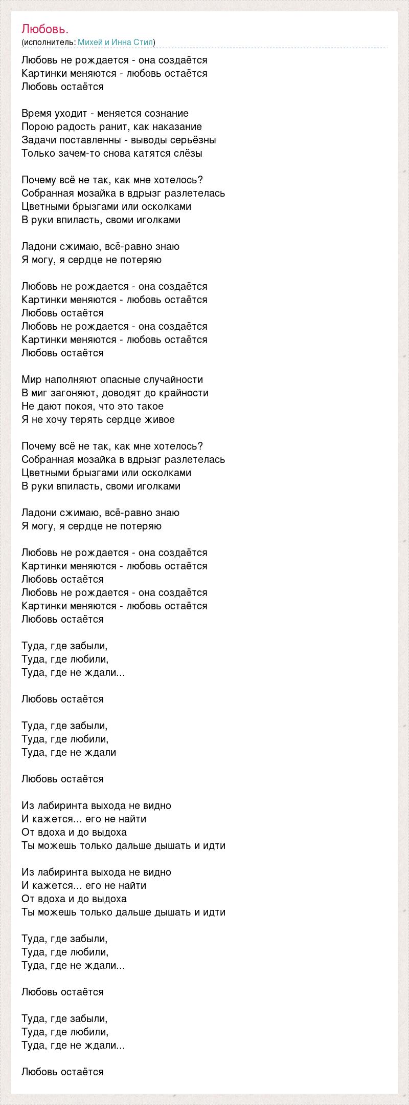Любовь не рождается - она создаётся Картинки меняются - любовь остаётся Любовь остаётся Время уходит - меняется сознание Порою радость ранит, как наказание Задачи поставленны - выводы серьёзны Только зачем-то снова катятся слёзы Почему всё не так, как мне хотелось? Собранная мозайка в вдрызг разлетелась Цветными брызгами или осколками В руки впиласть, своми иголками Ладони сжимаю, всё-равно знаю Я могу, я сердце не потеряю Любовь не рождается - она создаётся Картинки меняются - любовь остаётся Любовь остаётся Любовь не рождается - она создаётся Картинки меняются - любовь остаётся Любовь остаётся Мир наполняют опасные случайности В миг загоняют, доводят до крайности Не дают покоя, что это такое Я не хочу терять сердце живое Почему всё не так, как мне хотелось? Собранная мозайка в вдрызг разлетелась Цветными брызгами или осколками В руки впиласть, своми иголками Ладони сжимаю, всё-равно знаю Я могу, я сердце не потеряю Любовь не рождается - она создаётся Картинки меняются - любовь остаётся Любовь остаётся Любовь не рождается - она создаётся Картинки меняются - любовь остаётся Любовь остаётся Туда, где забыли, Туда, где любили, Туда, где не ждали... Любовь остаётся Туда, где забыли, Туда, где любили, Туда, где не ждали Любовь остаётся Из лабиринта выхода не видно И кажется... его не найти От вдоха и до выдоха Ты можешь только дальше дышать и идти Из лабиринта выхода не видно И кажется... его не найти От вдоха и до выдоха Ты можешь только дальше дышать и идти Туда, где забыли, Туда, где любили, Туда, где не ждали... Любовь остаётся Туда, где забыли, Туда, где любили, Туда, где не ждали... Любовь остаётся