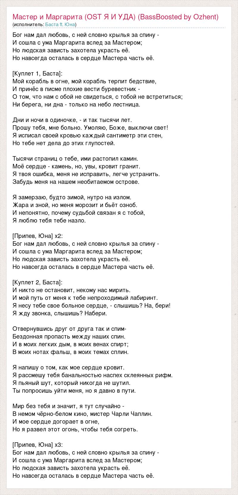Бог нам дал любовь, с ней словно крылья за спину - И сошла с ума Маргарита вслед за Мастером; Но людская зависть захотела украсть её. Но навсегда осталась в сердце Мастера часть её. [Куплет 1, Баста]: Мой корабль в огне, мой корабль терпит бедствие, И принёс в писме плохие вести буревестник - О том, что нам с обой не свидеться, с тобой не встретиться; Ни берега, ни дна - только на небо лестница. Дни и ночи в одиночке, - и так тысячи лет. Прошу тебя, мне больно. Умоляю, Боже, выключи свет! Я исписал своей кровью каждый сантиметр эти стен, Но тебе нет дела до этих глупостей. Тысячи страниц о тебе, ими растопил камин. Моё сердце - камень, но, увы, кровит гранит. Я твоя ошибка, меня не исправить, легче устранить. Забудь меня на нашем необитаемом острове. Я замерзаю, будто зимой, нутро на излом. Жара и зной, но меня морозит и бьёт озноб. И непонятно, почему судьбой связан я с тобой, Я люблю тебя тебе назло. [Припев, Юна] x2: Бог нам дал любовь, с ней словно крылья за спину - И сошла с ума Маргарита вслед за Мастером; Но людская зависть захотела украсть её. Но навсегда осталась в сердце Мастера часть её. [Куплет 2, Баста]: И никто не остановит, некому нас мирить. И мой путь от меня к тебе непроходимый лабиринт. Я несу тебе свое больное сердце, - слышишь? На, бери! Я жду звонка, слышишь? Набери. Отвернувшись друг от друга так и спим- Бездонная пропасть между наших спин. И в моих легких дым, в моих венах спирт; В моих нотах фальш, в моих темах сплин. Я напишу о том, как мое сердце кровит. Я рассмешу тебя банальностью наспех склеянных рифм. Я пьяный шут, который никогда не шутил. Ты попросишь уйти меня, но я давно в пути. Мир без тебя и значит, я тут случайно - В немом чёрно-белом кино, мистер Чарли Чаплин. И мое сердце догорает в огне, Но я развел этот огонь, чтобы тебя согреть. [Припев, Юна] x3: Бог нам дал любовь, с ней словно крылья за спину - И сошла с ума Маргарита вслед за Мастером; Но людская зависть захотела украсть её. Но навсегда осталась в сердце Мастера часть её.