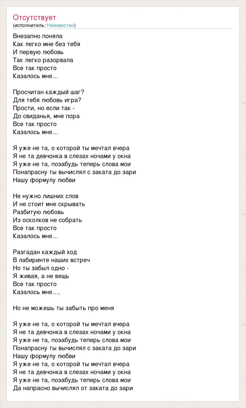 Внезапно поняла Как легко мне без тебя И первую любовь Так легко разорвала Все так просто Казалось мне… Просчитан каждый шаг? Для тебя любовь игра? Прости, но если так - До свиданья, мне пора Все так просто Казалось мне… Я уже не та, о которой ты мечтал вчера Я не та девчонка в слезах ночами у окна Я уже не та, позабудь теперь слова мои Понапрасну ты вычислял с заката до зари Нашу формулу любви Не нужно лишних слов И не стоит мне скрывать Разбитую любовь Из осколков не собрать Все так просто Казалось мне… Разгадан каждый ход В лабиринте наших встреч Но ты забыл одно - Я живая, а не вещь Все так просто Казалось мне…. Но не можешь ты забыть про меня Я уже не та, о которой ты мечтал вчера Я не та девчонка в слезах ночами у окна Я уже не та, позабудь теперь слова мои Понапрасну ты вычислял с заката до зари Нашу формулу любви Я уже не та, о которой ты мечтал вчера Я не та девчонка в слезах ночами у окна Я уже не та, позабудь теперь слова мои Да напрасно вычислял от заката до зари