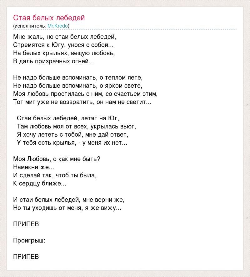 Мне жаль, но стаи белых лебедей, Стремятся к Югу, унося с собой... На белых крыльях, вещую любовь, В даль призрачных огней... Не надо больше вспоминать, о теплом лете, Не надо больше вспоминать, о ярком свете, Моя любовь простилась с ним, со счастьем этим, Тот миг уже не возвратить, он нам не светит... Стаи белых лебедей, летят на Юг, Там любовь моя от всех, укрылась вьюг, Я хочу лететь с тобой, мне дай ответ, У тебя есть крылья, - у меня их нет... Моя Любовь, о как мне быть? Намекни же... И сделай так, чтоб ты была, К сердцу ближе... И стаи белых лебедей, мне верни же, Но ты уходишь от меня, я же вижу... ПРИПЕВ Проигрыш: ПРИПЕВ