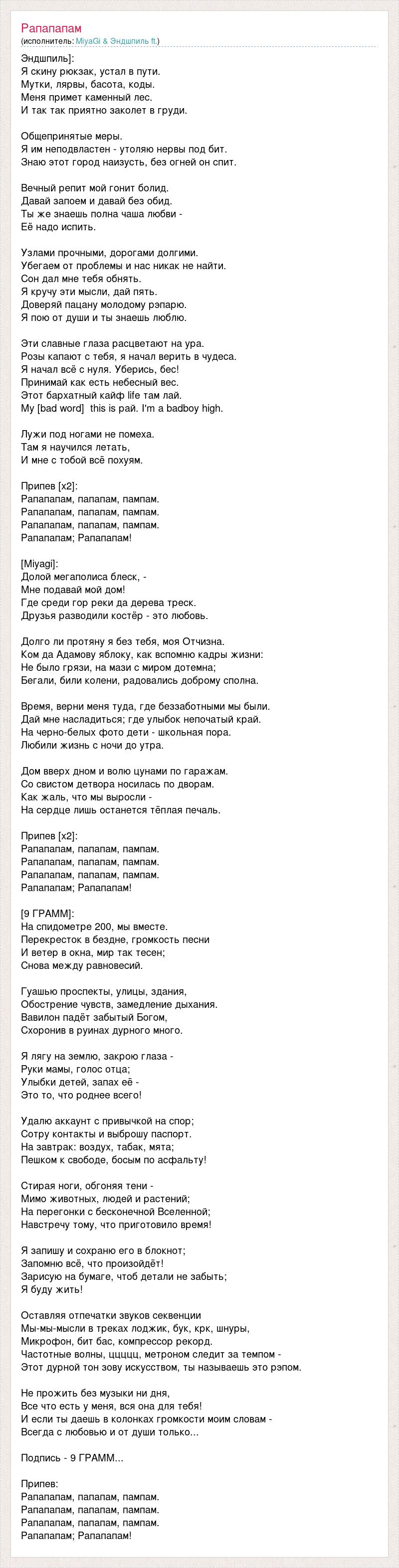 Эндшпиль]: Я скину рюкзак, устал в пути. Мутки, лярвы, басота, коды. Меня примет каменный лес. И так так приятно заколет в груди. Общепринятые меры. Я им неподвластен - утоляю нервы под бит. Знаю этот город наизусть, без огней он спит. Вечный репит мой гонит болид. Давай запоем и давай без обид. Ты же знаешь полна чаша любви - Её надо испить. Узлами прочными, дорогами долгими. Убегаем от проблемы и нас никак не найти. Сон дал мне тебя обнять. Я кручу эти мысли, дай пять. Доверяй пацану молодому рэпарю. Я пою от души и ты знаешь люблю. Эти славные глаза расцветают на ура. Розы капают с тебя, я начал верить в чудеса. Я начал всё с нуля. Уберись, бес! Принимай как есть небесный вес. Этот бархатный кайф life там лай. My [bad word] this is рай. I'm a badboy high. Лужи под ногами не помеха. Там я научился летать, И мне с тобой всё похуям. Припев [x2]: Рапапапам, папапам, пампам. Рапапапам, папапам, пампам. Рапапапам, папапам, пампам. Рапапапам; Рапапапам! [Miyagi]: Долой мегаполиса блеск, - Мне подавай мой дом! Где среди гор реки да дерева треск. Друзья разводили костёр - это любовь. Долго ли протяну я без тебя, моя Отчизна. Ком да Адамову яблоку, как вспомню кадры жизни: Не было грязи, на мази с миром дотемна; Бегали, били колени, радовались доброму сполна. Время, верни меня туда, где беззаботными мы были. Дай мне насладиться; где улыбок непочатый край. На черно-белых фото дети - школьная пора. Любили жизнь с ночи до утра. Дом вверх дном и волю цунами по гаражам. Со свистом детвора носилась по дворам. Как жаль, что мы выросли - На сердце лишь останется тёплая печаль. Припев [x2]: Рапапапам, папапам, пампам. Рапапапам, папапам, пампам. Рапапапам, папапам, пампам. Рапапапам; Рапапапам! [9 ГРАММ]: На спидометре 200, мы вместе. Перекресток в бездне, громкость песни И ветер в окна, мир так тесен; Снова между равновесий. Гуашью проспекты, улицы, здания, Обострение чувств, замедление дыхания. Вавилон падёт забытый Богом, Схоронив в руинах дурного много. Я лягу на землю, закрою глаза - Руки мамы, голос отца; Улыбки детей, запах её - Это то, что роднее всего! Удалю аккаунт с привычкой на спор; Сотру контакты и выброшу паспорт. На завтрак: воздух, табак, мята; Пешком к свободе, босым по асфальту! Стирая ноги, обгоняя тени - Мимо животных, людей и растений; На перегонки с бесконечной Вселенной; Навстречу тому, что приготовило время! Я запишу и сохраню его в блокнот; Запомню всё, что произойдёт! Зарисую на бумаге, чтоб детали не забыть; Я буду жить! Оставляя отпечатки звуков секвенции Мы-мы-мысли в треках лоджик, бук, крк, шнуры, Микрофон, бит бас, компрессор рекорд. Частотные волны, ццццц, метроном следит за темпом - Этот дурной тон зову искусством, ты называешь это рэпом. Не прожить без музыки ни дня, Все что есть у меня, вся она для тебя! И если ты даешь в колонках громкости моим словам - Всегда с любовью и от души только... Подпись - 9 ГРАММ... Припев: Рапапапам, папапам, пампам. Рапапапам, папапам, пампам. Рапапапам, папапам, пампам. Рапапапам; Рапапапам!