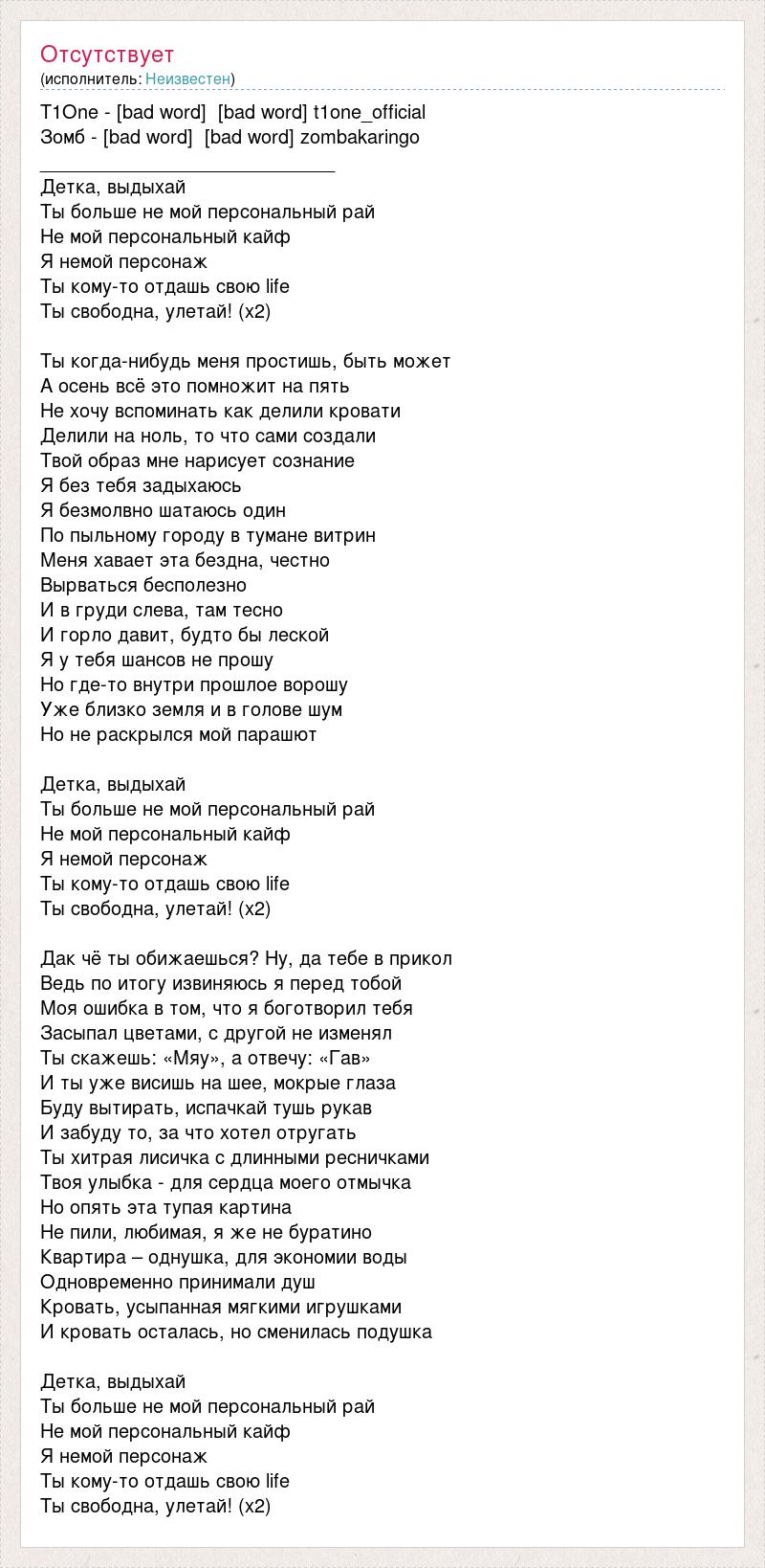 T1One - [bad word] [bad word] t1one_official Зомб - [bad word] [bad word] zombakaringo ____________________________ Детка, выдыхай Ты больше не мой персональный рай Не мой персональный кайф Я немой персонаж Ты кому-то отдашь свою life Ты свободна, улетай! (х2) Ты когда-нибудь меня простишь, быть может А осень всё это помножит на пять Не хочу вспоминать как делили кровати Делили на ноль, то что сами создали Твой образ мне нарисует сознание Я без тебя задыхаюсь Я безмолвно шатаюсь один По пыльному городу в тумане витрин Меня хавает эта бездна, честно Вырваться бесполезно И в груди слева, там тесно И горло давит, будто бы леской Я у тебя шансов не прошу Но где-то внутри прошлое ворошу Уже близко земля и в голове шум Но не раскрылся мой парашют Детка, выдыхай Ты больше не мой персональный рай Не мой персональный кайф Я немой персонаж Ты кому-то отдашь свою life Ты свободна, улетай! (х2) Дак чё ты обижаешься? Ну, да тебе в прикол Ведь по итогу извиняюсь я перед тобой Моя ошибка в том, что я боготворил тебя Засыпал цветами, с другой не изменял Ты скажешь: «Мяу», а отвечу: «Гав» И ты уже висишь на шее, мокрые глаза Буду вытирать, испачкай тушь рукав И забуду то, за что хотел отругать Ты хитрая лисичка с длинными ресничками Твоя улыбка - для сердца моего отмычка Но опять эта тупая картина Не пили, любимая, я же не буратино Квартира – однушка, для экономии воды Одновременно принимали душ Кровать, усыпанная мягкими игрушками И кровать осталась, но сменилась подушка Детка, выдыхай Ты больше не мой персональный рай Не мой персональный кайф Я немой персонаж Ты кому-то отдашь свою life Ты свободна, улетай! (х2)