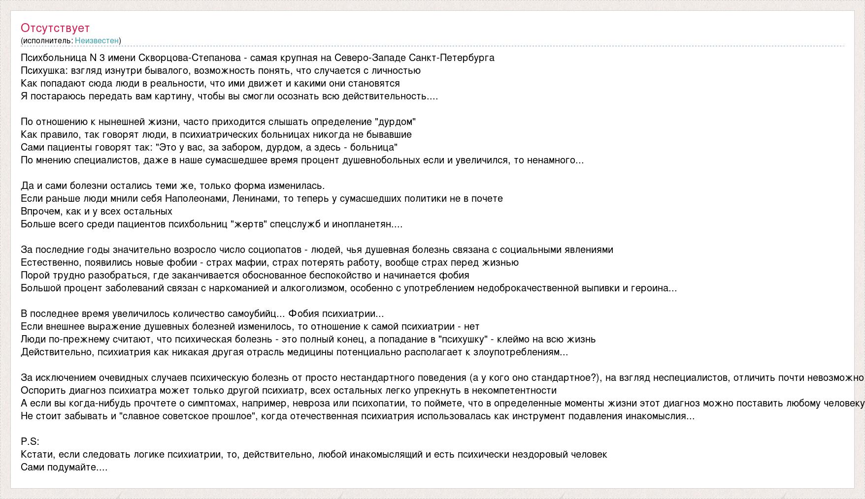 Главная→Исполнители→Неизвестен→Психбольница N 3 имени Скворцова-Степанова - самая крупная на Северо-Западе С