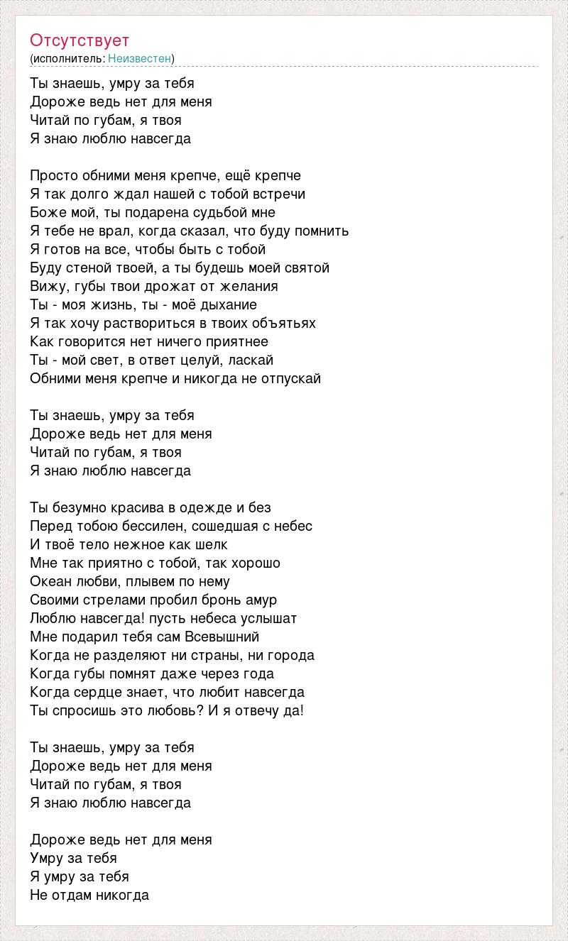 Ты знаешь, умру за тебя Дороже ведь нет для меня Читай по губам, я твоя Я знаю люблю навсегда Просто обними меня крепче, ещё крепче Я так долго ждал нашей с тобой встречи Боже мой, ты подарена судьбой мне Я тебе не врал, когда сказал, что буду помнить Я готов на все, чтобы быть с тобой Буду стеной твоей, а ты будешь моей святой Вижу, губы твои дрожат от желания Ты - моя жизнь, ты - моё дыхание Я так хочу раствориться в твоих объятьях Как говорится нет ничего приятнее Ты - мой свет, в ответ целуй, ласкай Обними меня крепче и никогда не отпускай Ты знаешь, умру за тебя Дороже ведь нет для меня Читай по губам, я твоя Я знаю люблю навсегда Ты безумно красива в одежде и без Перед тобою бессилен, сошедшая с небес И твоё тело нежное как шелк Мне так приятно с тобой, так хорошо Океан любви, плывем по нему Своими стрелами пробил бронь амур Люблю навсегда! пусть небеса услышат Мне подарил тебя сам Всевышний Когда не разделяют ни страны, ни города Когда губы помнят даже через года Когда сердце знает, что любит навсегда Ты спросишь это любовь? И я отвечу да! Ты знаешь, умру за тебя Дороже ведь нет для меня Читай по губам, я твоя Я знаю люблю навсегда Дороже ведь нет для меня Умру за тебя Я умру за тебя Не отдам никогда
