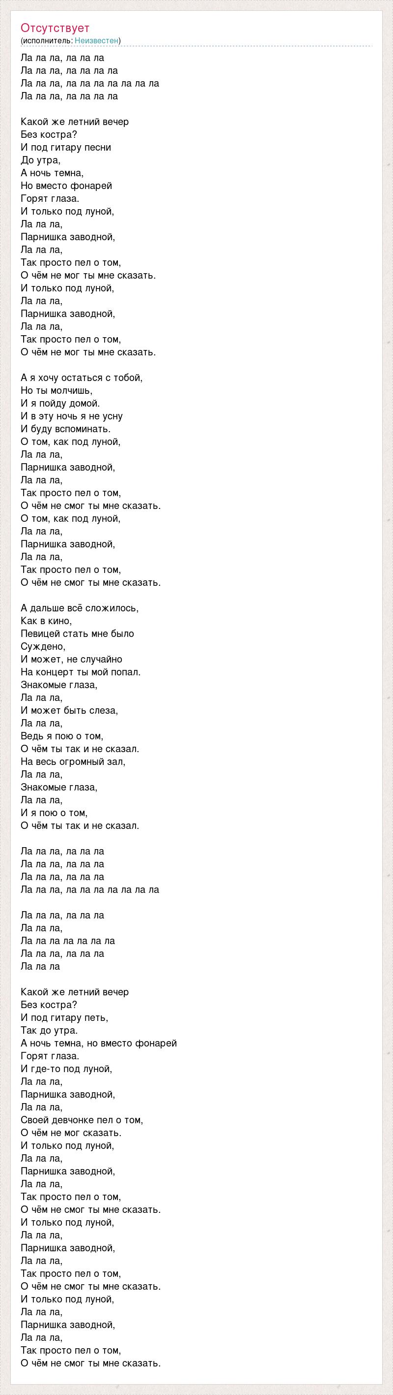Ла ла ла, ла ла ла Ла ла ла, ла ла ла ла Ла ла ла, ла ла ла ла ла ла ла Ла ла ла, ла ла ла ла Какой же летний вечер Без костра? И под гитару песни До утра, А ночь темна, Но вместо фонарей Горят глаза. И только под луной, Ла ла ла, Парнишка заводной, Ла ла ла, Так просто пел о том, О чём не мог ты мне сказать. И только под луной, Ла ла ла, Парнишка заводной, Ла ла ла, Так просто пел о том, О чём не мог ты мне сказать. А я хочу остаться с тобой, Но ты молчишь, И я пойду домой. И в эту ночь я не усну И буду вспоминать. О том, как под луной, Ла ла ла, Парнишка заводной, Ла ла ла, Так просто пел о том, О чём не смог ты мне сказать. О том, как под луной, Ла ла ла, Парнишка заводной, Ла ла ла, Так просто пел о том, О чём не смог ты мне сказать. А дальше всё сложилось, Как в кино, Певицей стать мне было Суждено, И может, не случайно На концерт ты мой попал. Знакомые глаза, Ла ла ла, И может быть слеза, Ла ла ла, Ведь я пою о том, О чём ты так и не сказал. На весь огромный зал, Ла ла ла, Знакомые глаза, Ла ла ла, И я пою о том, О чём ты так и не сказал. Ла ла ла, ла ла ла Ла ла ла, ла ла ла Ла ла ла, ла ла ла Ла ла ла, ла ла ла ла ла ла ла Ла ла ла, ла ла ла Ла ла ла, Ла ла ла ла ла ла ла Ла ла ла, ла ла ла Ла ла ла Какой же летний вечер Без костра? И под гитару петь, Так до утра. А ночь темна, но вместо фонарей Горят глаза. И где-то под луной, Ла ла ла, Парнишка заводной, Ла ла ла, Своей девчонке пел о том, О чём не мог сказать. И только под луной, Ла ла ла, Парнишка заводной, Ла ла ла, Так просто пел о том, О чём не смог ты мне сказать. И только под луной, Ла ла ла, Парнишка заводной, Ла ла ла, Так просто пел о том, О чём не смог ты мне сказать. И только под луной, Ла ла ла, Парнишка заводной, Ла ла ла, Так просто пел о том, О чём не смог ты мне сказать.