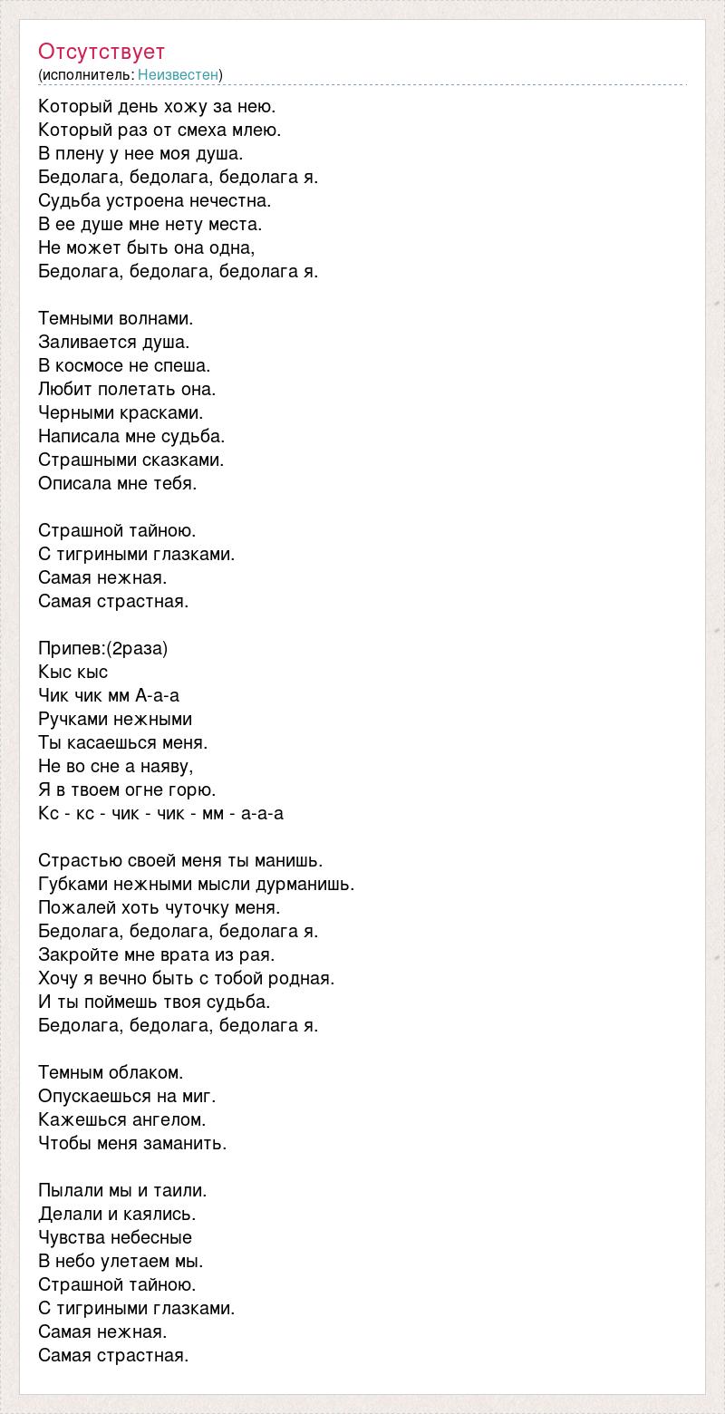 Который день хожу за нею. Который раз от смеха млею. В плену у нее моя душа. Бедолага, бедолага, бедолага я. Судьба устроена нечестна. В ее душе мне нету места. Не может быть она одна, Бедолага, бедолага, бедолага я. Темными волнами. Заливается душа. В космосе не спеша. Любит полетать она. Черными красками. Написала мне судьба. Страшными сказками. Описала мне тебя. Страшной тайною. С тигриными глазками. Самая нежная. Самая страстная. Припев:(2раза) Кыс кыс Чик чик мм А-а-а Ручками нежными Ты касаешься меня. Не во сне а наяву, Я в твоем огне горю. Кс - кс - чик - чик - мм - а-а-а Страстью своей меня ты манишь. Губками нежными мысли дурманишь. Пожалей хоть чуточку меня. Бедолага, бедолага, бедолага я. Закройте мне врата из рая. Хочу я вечно быть с тобой родная. И ты поймешь твоя судьба. Бедолага, бедолага, бедолага я. Темным облаком. Опускаешься на миг. Кажешься ангелом. Чтобы меня заманить. Пылали мы и таили. Делали и каялись. Чувства небесные В небо улетаем мы. Страшной тайною. С тигриными глазками. Самая нежная. Самая страстная.