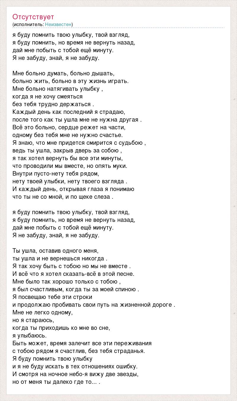 я буду помнить твою улыбку, твой взгляд, я буду помнить, но время не вернуть назад, дай мне побыть с тобой ещё минуту. Я не забуду, знай, я не забуду. Мне больно думать, больно дышать, больно жить, больно в эту жизнь играть. Мне больно натягивать улыбку , когда я не хочу смеяться без тебя трудно держаться . Каждый день как последний я страдаю, после того как ты ушла мне не нужна другая . Всё это больно, сердце режет на части, одному без тебя мне не нужно счастье. Я знаю, что мне придется смирится с судьбою , ведь ты ушла, закрыв дверь за собою , я так хотел вернуть бы все эти минуты, что проводили мы вместе, но опять муки. Внутри пусто-нету тебя рядом, нету твоей улыбки, нету твоего взгляда . И каждый день, открывая глаза я понимаю что ты не со мной, и по щеке слеза . я буду помнить твою улыбку, твой взгляд, я буду помнить, но время не вернуть назад, дай мне побыть с тобой ещё минуту. Я не забуду, знай, я не забуду. Ты ушла, оставив одного меня, ты ушла и не вернешься никогда . Я так хочу быть с тобою но мы не вместе . И всё что я хотел сказать-всё в этой песне. Мне было так хорошо только с тобою , я был счастливым, когда ты за моей спиною . Я посвещаю тебе эти строки и продолжаю пробивать свои путь на жизненной дороге . Мне не легко одному, но я стараюсь, когда ты приходишь ко мне во сне, я улыбаюсь. Быть может, время залечит все эти переживания с тобою рядом я счастлив, без тебя страданья. Я буду помнить твою улыбку и я не буду искать в тех отношениях ошибку. И смотря на ночное небо-я вижу две звезды, но от меня ты далеко где то... .