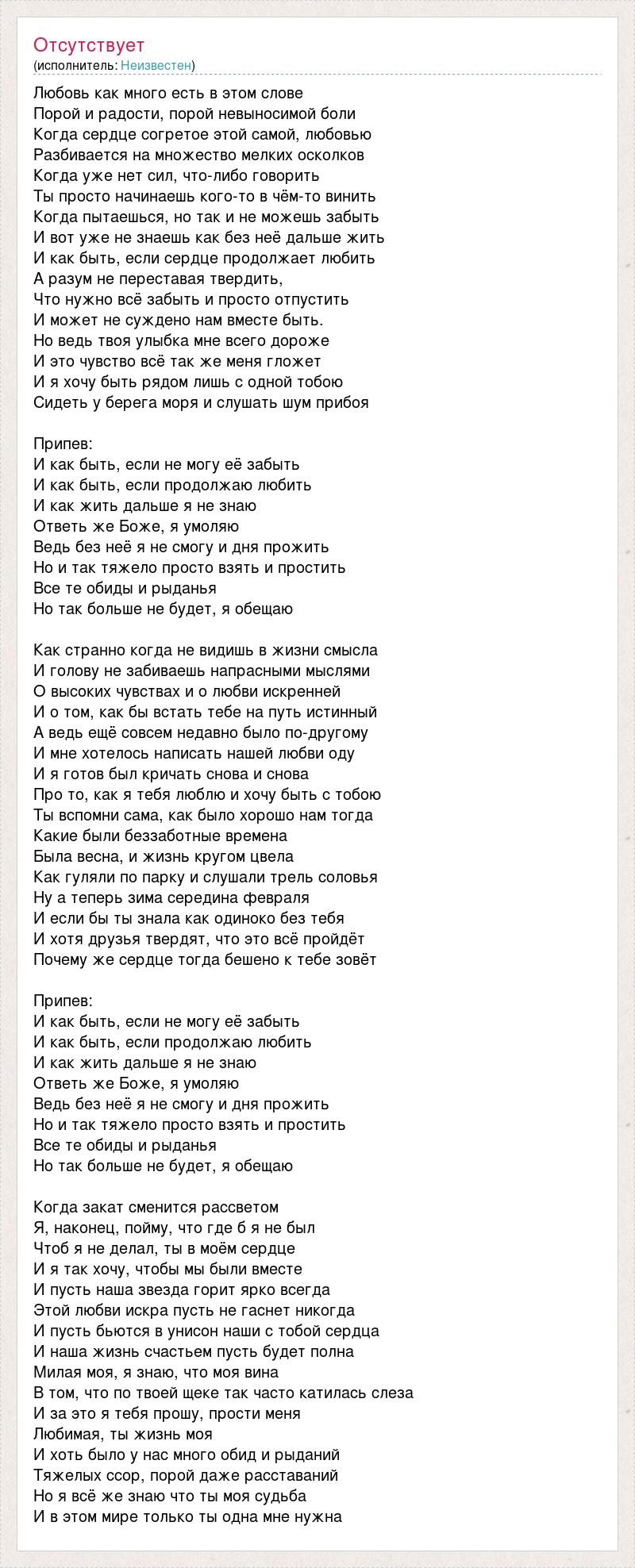Любовь как много есть в этом слове Порой и радости, порой невыносимой боли Когда сердце согретое этой самой, любовью Разбивается на множество мелких осколков Когда уже нет сил, что-либо говорить Ты просто начинаешь кого-то в чём-то винить Когда пытаешься, но так и не можешь забыть И вот уже не знаешь как без неё дальше жить И как быть, если сердце продолжает любить А разум не переставая твердить, Что нужно всё забыть и просто отпустить И может не суждено нам вместе быть. Но ведь твоя улыбка мне всего дороже И это чувство всё так же меня гложет И я хочу быть рядом лишь с одной тобою Сидеть у берега моря и слушать шум прибоя Припев: И как быть, если не могу её забыть И как быть, если продолжаю любить И как жить дальше я не знаю Ответь же Боже, я умоляю Ведь без неё я не смогу и дня прожить Но и так тяжело просто взять и простить Все те обиды и рыданья Но так больше не будет, я обещаю Как странно когда не видишь в жизни смысла И голову не забиваешь напрасными мыслями О высоких чувствах и о любви искренней И о том, как бы встать тебе на путь истинный А ведь ещё совсем недавно было по-другому И мне хотелось написать нашей любви оду И я готов был кричать снова и снова Про то, как я тебя люблю и хочу быть с тобою Ты вспомни сама, как было хорошо нам тогда Какие были беззаботные времена Была весна, и жизнь кругом цвела Как гуляли по парку и слушали трель соловья Ну а теперь зима середина февраля И если бы ты знала как одиноко без тебя И хотя друзья твердят, что это всё пройдёт Почему же сердце тогда бешено к тебе зовёт Припев: И как быть, если не могу её забыть И как быть, если продолжаю любить И как жить дальше я не знаю Ответь же Боже, я умоляю Ведь без неё я не смогу и дня прожить Но и так тяжело просто взять и простить Все те обиды и рыданья Но так больше не будет, я обещаю Когда закат сменится рассветом Я, наконец, пойму, что где б я не был Чтоб я не делал, ты в моём сердце И я так хочу, чтобы мы были вместе И пусть наша звезда горит ярко всегда Этой любви искра пусть не гаснет никогда И пусть бьются в унисон наши с тобой сердца И наша жизнь счастьем пусть будет полна Милая моя, я знаю, что моя вина В том, что по твоей щеке так часто катилась слеза И за это я тебя прошу, прости меня Любимая, ты жизнь моя И хоть было у нас много обид и рыданий Тяжелых ссор, порой даже расставаний Но я всё же знаю что ты моя судьба И в этом мире только ты одна мне нужна