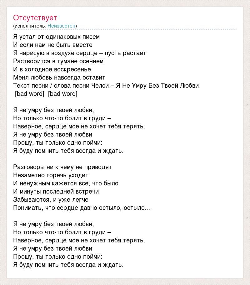 Я устал от одинаковых писем И если нам не быть вместе Я нарисую в воздухе сердце – пусть растает Растворится в тумане осеннем И в холодное воскресенье Меня любовь навсегда оставит Текст песни / слова песни Челси – Я Не Умру Без Твоей Любви [bad word] [bad word] Я не умру без твоей любви, Но только что-то болит в груди – Наверное, сердце мое не хочет тебя терять. Я не умру без твоей любви Прошу, ты только одно пойми: Я буду помнить тебя всегда и ждать. Разговоры ни к чему не приводят Незаметно горечь уходит И ненужным кажется все, что было И минуты последней встречи Забываются, и уже легче Понимать, что сердце давно остыло, остыло… Я не умру без твоей любви, Но только что-то болит в груди – Наверное, сердце мое не хочет тебя терять. Я не умру без твоей любви Прошу, ты только одно пойми: Я буду помнить тебя всегда и ждать.