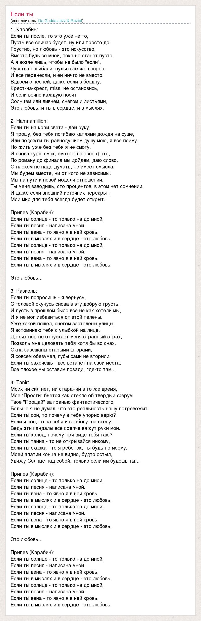 1. Карабин: Если ты после, то это уже не то, Пусть все сейчас будет, ну или просто до. Грустно, но любовь - это искусство, Вместе будь со мной, пока не станет пусто. А я возле лишь, чтобы не было "если", Чувства погибали, пульс все же восрес. И все перенесли, и ей ничто не вместо, Вдвоем с песней, даже если в бездну. Крест-на-крест, miss, не остановись, И если вечно каждую носит Солнцем или ливнем, снегом и листьями, Это любовь, и ты в сердце, и в мыслях. 2. Hamnamillion: Если ты на край света - дай руку, Я прошу, без тебя погибаю каплями дождя на суше, Или подожги ты равнодушием душу мою, я все пойму, Но жить уже без тебя я не смогу. И снова курю смок, смотрю на твое фото, По роману до финала мы дойдем, даю слово. О плохом не надо думать, не имеет смысла, Мы будем вместе, ни от кого не зависимы. Мы на пути к новой модели отношении, Ты меня заводишь, сто процентов, в этом нет сомнении. И даже если внешний источник перекрыт, Мой мир для тебя всегда будет открыт. Припев (Карабин): Если ты солнце - то только на до мной, Если ты песня - написана мной. Если ты вена - то явно я в ней кровь, Если ты в мыслях и в сердце - это любовь. Если ты солнце - то только на до мной, Если ты песня - написана мной. Если ты вена - то явно я в ней кровь, Если ты в мыслях и в сердце - это любовь. Это любовь... 3. Разиэль: Если ты попросишь - я вернусь, С головой окунусь снова в эту добрую грусть. И пусть в прошлом было все не как хотели мы, И я не мог избавиться от этой пелены. Уже какой пошел, снегом застелены улицы, Я вспоминаю тебя с улыбкой на лице. До сих пор не отпускает меня странный страх, Позволь мне целовать тебя хотя бы во снах. Окна завешаны старыми шторами, Я совсем обезумел, губы сами не вторили. Если ты захочешь - все встанет на свои места, Все плохое мы оставим позади, где-то там... 4. Tanir: Моих ни сил нет, ни старании в то же время, Мое "Прости" бьется как стекло об твердый ферум. Твое "Прощай" за гранью фантастического, Больше я не думал, что это реальность нашу потревожит. Если ты сон, то почему в тебя упорно верю? Если я сон, то на себя и вербову, на стену, Ведь эти кандалы все крепче вяжут руки мои. Если ты холод, почему при виде тебя таю? Если ты тайна - то не открывайся никому, Если ты сказка - то я ребенок, ты будь по моему. Моей апатии конца не видно, будто остыл, Увижу Солнце над собой, только если им будешь ты... Припев (Карабин): Если ты солнце - то только на до мной, Если ты песня - написана мной. Если ты вена - то явно я в ней кровь, Если ты в мыслях и в сердце - это любовь. Если ты солнце - то только на до мной, Если ты песня - написана мной. Если ты вена - то явно я в ней кровь, Если ты в мыслях и в сердце - это любовь. Это любовь... Припев (Карабин): Если ты солнце - то только на до мной, Если ты песня - написана мной. Если ты вена - то явно я в ней кровь, Если ты в мыслях и в сердце - это любовь. Если ты солнце - то только на до мной, Если ты песня - написана мной. Если ты вена - то явно я в ней кровь, Если ты в мыслях и в сердце - это любовь.