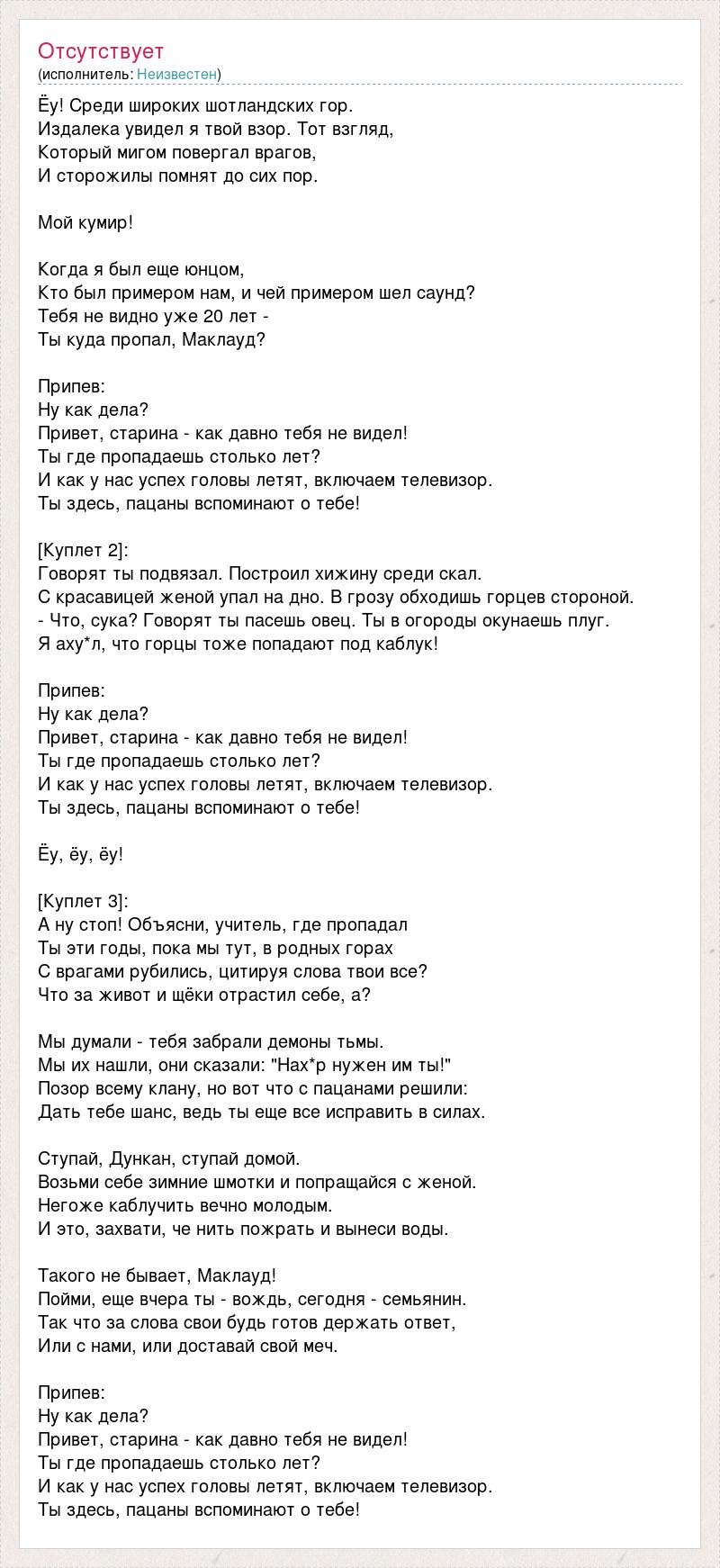 Ёу! Среди широких шотландских гор. Издалека увидел я твой взор. Тот взгляд, Который мигом повергал врагов, И сторожилы помнят до сих пор. Мой кумир! Когда я был еще юнцом, Кто был примером нам, и чей примером шел саунд? Тебя не видно уже 20 лет - Ты куда пропал, Маклауд? Припев: Ну как дела? Привет, старина - как давно тебя не видел! Ты где пропадаешь столько лет? И как у нас успех головы летят, включаем телевизор. Ты здесь, пацаны вспоминают о тебе! [Куплет 2]: Говорят ты подвязал. Построил хижину среди скал. С красавицей женой упал на дно. В грозу обходишь горцев стороной. - Что, сука? Говорят ты пасешь овец. Ты в огороды окунаешь плуг. Я аху*л, что горцы тоже попадают под каблук! Припев: Ну как дела? Привет, старина - как давно тебя не видел! Ты где пропадаешь столько лет? И как у нас успех головы летят, включаем телевизор. Ты здесь, пацаны вспоминают о тебе! Ёу, ёу, ёу! [Куплет 3]: А ну стоп! Объясни, учитель, где пропадал Ты эти годы, пока мы тут, в родных горах С врагами рубились, цитируя слова твои все? Что за живот и щёки отрастил себе, а? Мы думали - тебя забрали демоны тьмы. Мы их нашли, они сказали: "Нах*р нужен им ты!" Позор всему клану, но вот что с пацанами решили: Дать тебе шанс, ведь ты еще все исправить в силах. Ступай, Дункан, ступай домой. Возьми себе зимние шмотки и попращайся с женой. Негоже каблучить вечно молодым. И это, захвати, че нить пожрать и вынеси воды. Такого не бывает, Маклауд! Пойми, еще вчера ты - вождь, сегодня - семьянин. Так что за слова свои будь готов держать ответ, Или с нами, или доставай свой меч. Припев: Ну как дела? Привет, старина - как давно тебя не видел! Ты где пропадаешь столько лет? И как у нас успех головы летят, включаем телевизор. Ты здесь, пацаны вспоминают о тебе!