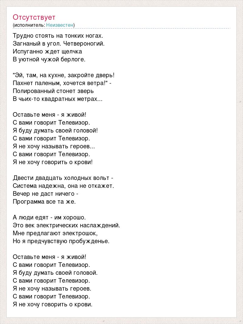 Трудно стоять на тонких ногах. Загнаный в угол. Четвероногий. Испуганно ждет щелчка В уютной чужой берлоге. "Эй, там, на кухне, закройте дверь! Пахнет паленым, хочется ветра!" - Полированный стонет зверь В чьих-то квадратных метрах... Оставьте меня - я живой! С вами говорит Телевизор. Я буду думать своей головой! С вами говорит Телевизор. Я не хочу называть героев... С вами говорит Телевизор. Я не хочу говорить о крови! Двести двадцать холодных вольт - Система надежна, она не откажет. Вечер не даст ничего - Программа все та же. А люди едят - им хорошо. Это век электрических наслаждений. Мне предлагают электрошок, Но я предчувствую пробужденье. Оставьте меня - я живой! С вами говорит Телевизор. Я буду думать своей головой. С вами говорит Телевизор. Я не хочу называть героев. С вами говорит Телевизор. Я не хочу говорить о крови.