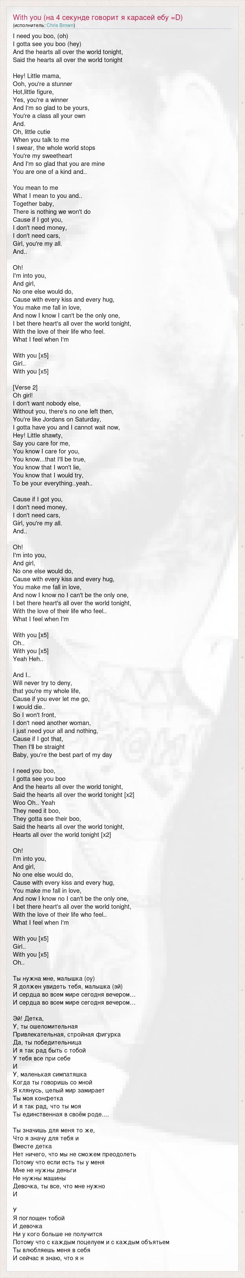 I need you boo, (oh) I gotta see you boo (hey) And the hearts all over the world tonight, Said the hearts all over the world tonight Hey! Little mama, Ooh, you're a stunner Hot,little figure, Yes, you're a winner And I'm so glad to be yours, You're a class all your own And. Oh, little cutie When you talk to me I swear, the whole world stops You're my sweetheart And I'm so glad that you are mine You are one of a kind and.. You mean to me What I mean to you and.. Together baby, There is nothing we won't do Cause if I got you, I don't need money, I don't need cars, Girl, you're my all. And.. Oh! I'm into you, And girl, No one else would do, Cause with every kiss and every hug, You make me fall in love, And now I know I can't be the only one, I bet there heart's all over the world tonight, With the love of their life who feel. What I feel when I'm With you [x5] Girl.. With you [x5] [Verse 2] Oh girl! I don't want nobody else, Without you, there's no one left then, You're like Jordans on Saturday, I gotta have you and I cannot wait now, Hey! Little shawty, Say you care for me, You know I care for you, You know...that I'll be true, You know that I won't lie, You know that I would try, To be your everything..yeah.. Cause if I got you, I don't need money, I don't need cars, Girl, you're my all. And.. Oh! I'm into you, And girl, No one else would do, Cause with every kiss and every hug, You make me fall in love, And now I know no I can't be the only one, I bet there heart's all over the world tonight, With the love of their life who feel.. What I feel when I'm With you [x5] Oh.. With you [x5] Yeah Heh.. And I.. Will never try to deny, that you're my whole life, Cause if you ever let me go, I would die.. So I won't front, I don't need another woman, I just need your all and nothing, Cause if I got that, Then I'll be straight Baby, you're the best part of my day I need you boo, I gotta see you boo And the hearts all over the world tonight, Said the hearts all over the world tonight [x2] Woo Oh.. Yeah They need it boo, They gotta see their boo, Said the hearts all over the world tonight, Hearts all over the world tonight [x2] Oh! I'm into you, And girl, No one else would do, Cause with every kiss and every hug, You make me fall in love, And now I know no I can't be the only one, I bet there heart's all over the world tonight, With the love of their life who feel.. What I feel when I'm With you [x5] Girl.. With you [x5] Oh.. Ты нужна мне, малышка (оу) Я должен увидеть тебя, малышка (эй) И сердца во всем мире сегодня вечером… И сердца во всем мире сегодня вечером… Эй! Детка, У, ты ошеломительная Привлекательная, стройная фигурка Да, ты победительница И я так рад быть с тобой У тебя все при себе И У, маленькая симпатяшка Когда ты говоришь со мной Я клянусь, целый мир замирает Ты моя конфетка И я так рад, что ты моя Ты единственная в своём роде.... Ты значишь для меня то же, Что я значу для тебя и Вместе детка Нет ничего, что мы не сможем преодолеть Потому что если есть ты у меня Мне не нужны деньги Не нужны машины Девочка, ты все, что мне нужно И У Я поглощен тобой И девочка Ни у кого больше не получится Потому что с каждым поцелуем и с каждым объятьем Ты влюбляешь меня в себя И сейчас я знаю, что я н