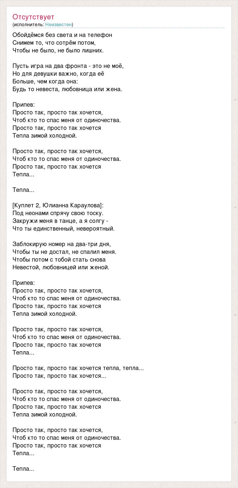 Обойдёмся без света и на телефон Снимем то, что сотрём потом, Чтобы не было, не было лишних. Пусть игра на два фронта - это не моё, Но для девушки важно, когда её Больше, чем когда она: Будь то невеста, любовница или жена. Припев: Просто так, просто так хочется, Чтоб кто то спас меня от одиночества. Просто так, просто так хочется Тепла зимой холодной. Просто так, просто так хочется, Чтоб кто то спас меня от одиночества. Просто так, просто так хочется Тепла... Тепла... [Куплет 2, Юлианна Караулова]: Под неонами спрячу свою тоску. Закружи меня в танце, а я солгу - Что ты единственный, невероятный. Заблокирую номер на два-три дня, Чтобы ты не достал, не спалил меня. Чтобы потом с тобой стать снова Невестой, любовницей или женой. Припев: Просто так, просто так хочется, Чтоб кто то спас меня от одиночества. Просто так, просто так хочется Тепла зимой холодной. Просто так, просто так хочется, Чтоб кто то спас меня от одиночества. Просто так, просто так хочется Тепла... Просто так, просто так хочется тепла, тепла... Просто так, просто так хочется... Просто так, просто так хочется, Чтоб кто то спас меня от одиночества. Просто так, просто так хочется Тепла зимой холодной. Просто так, просто так хочется, Чтоб кто то спас меня от одиночества. Просто так, просто так хочется Тепла... Тепла...