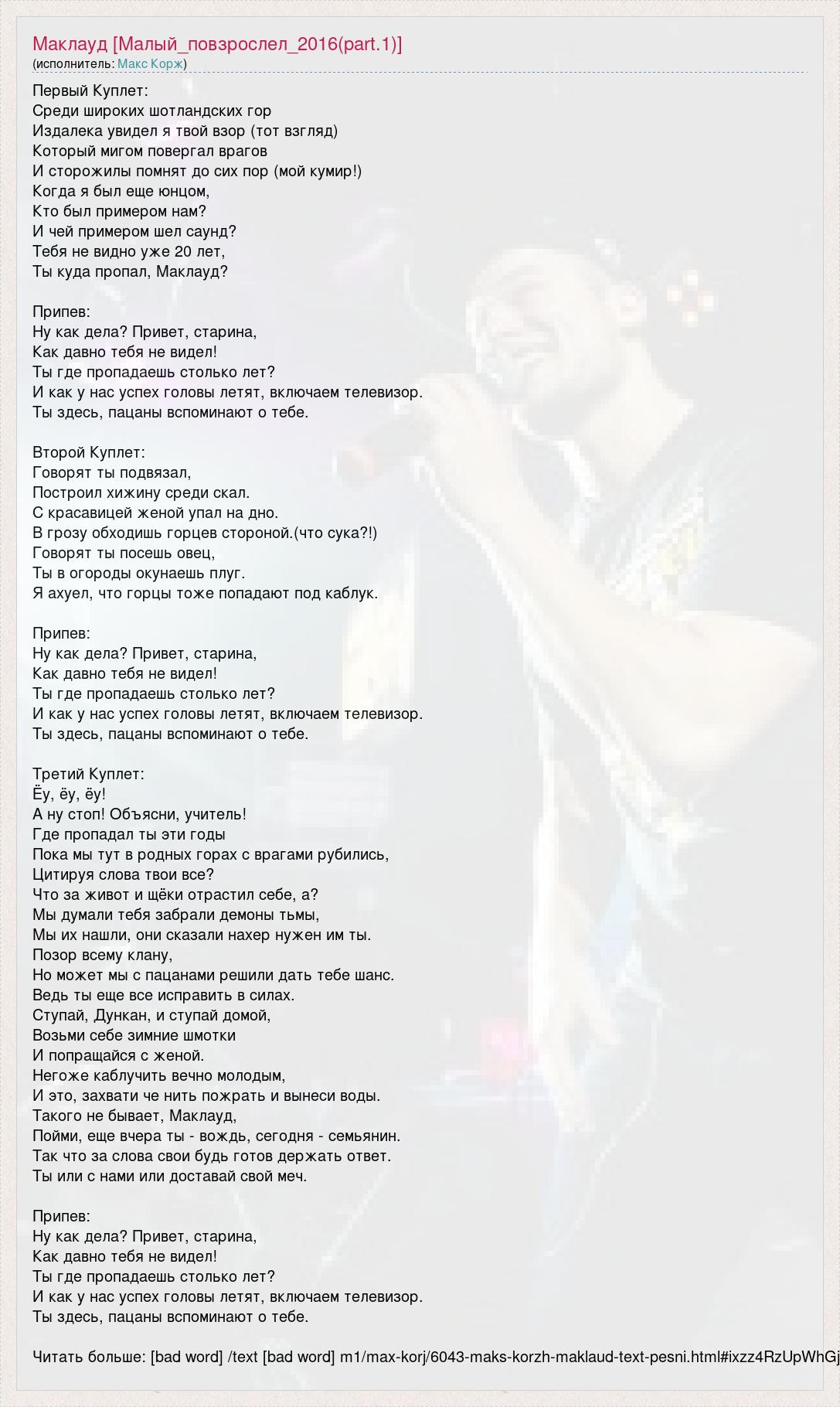 Первый Куплет: Среди широких шотландских гор Издалека увидел я твой взор (тот взгляд) Который мигом повергал врагов И сторожилы помнят до сих пор (мой кумир!) Когда я был еще юнцом, Кто был примером нам? И чей примером шел саунд? Тебя не видно уже 20 лет, Ты куда пропал, Маклауд? Припев: Ну как дела? Привет, старина, Как давно тебя не видел! Ты где пропадаешь столько лет? И как у нас успех головы летят, включаем телевизор. Ты здесь, пацаны вспоминают о тебе. Второй Куплет: Говорят ты подвязал, Построил хижину среди скал. С красавицей женой упал на дно. В грозу обходишь горцев стороной.(что сука?!) Говорят ты посешь овец, Ты в огороды окунаешь плуг. Я ахуел, что горцы тоже попадают под каблук. Припев: Ну как дела? Привет, старина, Как давно тебя не видел! Ты где пропадаешь столько лет? И как у нас успех головы летят, включаем телевизор. Ты здесь, пацаны вспоминают о тебе. Третий Куплет: Ёу, ёу, ёу! А ну стоп! Объясни, учитель! Где пропадал ты эти годы Пока мы тут в родных горах с врагами рубились, Цитируя слова твои все? Что за живот и щёки отрастил себе, а? Мы думали тебя забрали демоны тьмы, Мы их нашли, они сказали нахер нужен им ты. Позор всему клану, Но может мы с пацанами решили дать тебе шанс. Ведь ты еще все исправить в силах. Ступай, Дункан, и ступай домой, Возьми себе зимние шмотки И попращайся с женой. Негоже каблучить вечно молодым, И это, захвати че нить пожрать и вынеси воды. Такого не бывает, Маклауд, Пойми, еще вчера ты - вождь, сегодня - семьянин. Так что за слова свои будь готов держать ответ. Ты или с нами или доставай свой меч. Припев: Ну как дела? Привет, старина, Как давно тебя не видел! Ты где пропадаешь столько лет? И как у нас успех головы летят, включаем телевизор. Ты здесь, пацаны вспоминают о тебе. Читать больше: [bad word] /text [bad word] m1/max-korj/6043-maks-korzh-maklaud-text-pesni.html#ixzz4RzUpWhGj
