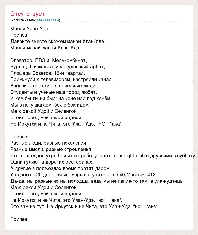 Манай Улан-Удэ Припев: Давайте вместе скажем манай Улан-Удэ Манай-манай-манай Улан-Удэ. Элеватор, ПВЗ и Мелькомбинат, Бурвод, Шишковка, улан-удэнский арбат, Площадь Советов, 18-й квартал, Примкнули к телевизорам, настроили канал . Рабочие, крестьяне, приезжие люди , Студенты и учёные наш город любят. И кем бы ты ни был: на коне или под конём Мы в ногу шагаем, бок о бок идём. Меж рекой Удой и Селенгой Стоит город мой такой родной Не Иркутск и не Чита, это Улан-Удэ, “НО”, “аһа”. Припев: Разные люди, разные поколения Разные мысли, разные стремленья Кто-то каждое утро бежит на работу, а кто-то в night-club с друзьями в субботу . Одни гуляют в дорогих ресторанах, А другие в подъездах время тратят даром У одного в 20 дорогая иномарка, а у второго в 40 Москвич-412. Да-да, мы разные но мы молодцы, ведь мы не какие-то там, а улан-удэнцы Меж рекой Удой и Селенгой Стоит город мой такой родной Не Иркутск и не Чита, это Улан-Удэ, “но”, “аһа”. Это вам не тут. Не Иркутск и не Чита, это Улан-Удэ, “но”, “аһа”. Припев: