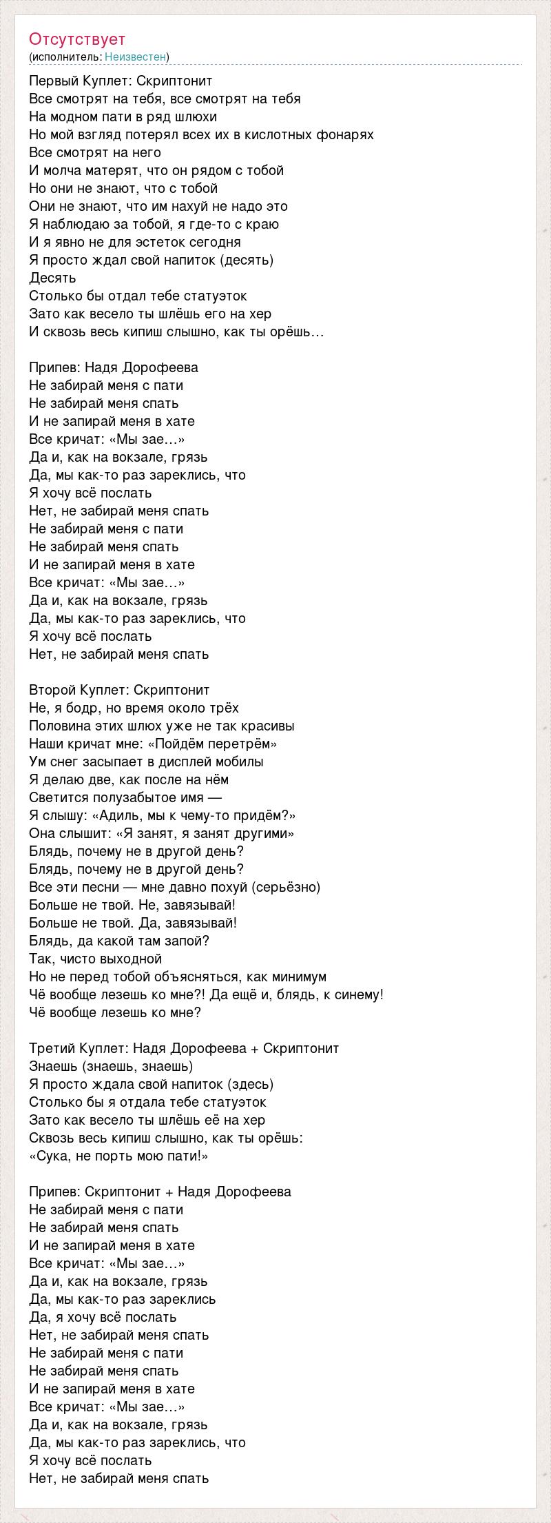 Первый Куплет: Скриптонит Все смотрят на тебя, все смотрят на тебя На модном пати в ряд шлюхи Но мой взгляд потерял всех их в кислотных фонарях Все смотрят на него И молча матерят, что он рядом с тобой Но они не знают, что с тобой Они не знают, что им нахуй не надо это Я наблюдаю за тобой, я где-то с краю И я явно не для эстеток сегодня Я просто ждал свой напиток (десять) Десять Столько бы отдал тебе статуэток Зато как весело ты шлёшь его на хер И сквозь весь кипиш слышно, как ты орёшь… Припев: Надя Дорофеева Не забирай меня с пати Не забирай меня спать И не запирай меня в хате Все кричат: «Мы зае…» Да и, как на вокзале, грязь Да, мы как-то раз зареклись, что Я хочу всё послать Нет, не забирай меня спать Не забирай меня с пати Не забирай меня спать И не запирай меня в хате Все кричат: «Мы зае…» Да и, как на вокзале, грязь Да, мы как-то раз зареклись, что Я хочу всё послать Нет, не забирай меня спать Второй Куплет: Скриптонит Не, я бодр, но время около трёх Половина этих шлюх уже не так красивы Наши кричат мне: «Пойдём перетрём» Ум снег засыпает в дисплей мобилы Я делаю две, как после на нём Светится полузабытое имя — Я слышу: «Адиль, мы к чему-то придём?» Она слышит: «Я занят, я занят другими» Блядь, почему не в другой день? Блядь, почему не в другой день? Все эти песни — мне давно похуй (серьёзно) Больше не твой. Не, завязывай! Больше не твой. Да, завязывай! Блядь, да какой там запой? Так, чисто выходной Но не перед тобой объясняться, как минимум Чё вообще лезешь ко мне?! Да ещё и, блядь, к синему! Чё вообще лезешь ко мне? Третий Куплет: Надя Дорофеева + Скриптонит Знаешь (знаешь, знаешь) Я просто ждала свой напиток (здесь) Столько бы я отдала тебе статуэток Зато как весело ты шлёшь её на хер Сквозь весь кипиш слышно, как ты орёшь: «Сука, не порть мою пати!» Припев: Скриптонит + Надя Дорофеева Не забирай меня с пати Не забирай меня спать И не запирай меня в хате Все кричат: «Мы зае…» Да и, как на вокзале, грязь Да, мы как-то раз зареклись Да, я хочу всё послать Нет, не забирай меня спать Не забирай меня с пати Не забирай меня спать И не запирай меня в хате Все кричат: «Мы зае…» Да и, как на вокзале, грязь Да, мы как-то раз зареклись, что Я хочу всё послать Нет, не забирай меня спать