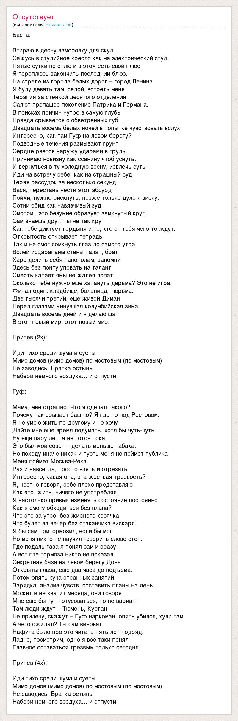 Баста: Втираю в десну заморозку для скул Сажусь в студийное кресло как на электрический стул. Пятые сутки не сплю и в этом есть свой плюс Я тороплюсь закончить последний блюз. На стреле из города белых дорог – город Ленина Я буду девять там, седой, встреть меня Терапия за стенкой десятого отделения Салют пропащее поколение Патрика и Германа. В поисках причин нутро в самую глубь Правда срывается с обветренных губ. Двадцать восемь белых ночей в попытке чувствовать вслух Интересно, как там Гуф на левом берегу? Подводные течения размывают грунт Сердце рвется наружу ударами в грудь. Принимаю новизну как ссанину чтоб уснуть. И вернуться в ту холодную весну, извлечь суть Иди на встречу себе, как на страшный суд Теряя рассудок за несколько секунд. Вася, перестань нести этот абсурд Пойми, нужно рискнуть, позже только дуло к виску. Сотни обид как навязчивый зуд Смотри , это безумие образует замкнутый круг. Сам знаешь друг, ты не так крут Как тебе диктует гордыня и те, кто от тебя чего-то ждут. Открытость открывает тетрадь Так и не смог сомкнуть глаз до самого утра. Волей исцарапаны стены палат, брат Харе делить себя напополам, запомни Здесь без понту уповать на талант Смерть капает ямы не жалея лопат. Сколько тебе нужно еще хапануть дерьма? Это не игра, Финал один: кладбище, больница, тюрьма. Две тысячи третий, еще живой Диман Перед глазами минувшая колумбийская зима. Двадцать восемь дней и я делаю шаг В этот новый мир, этот новый мир. Припев (2х): Иди тихо среди шума и суеты Мимо домов (мимо домов) по мостовым (по мостовым) Не заводись. Братка остынь Набери немного воздуха… и отпусти Гуф: Мама, мне страшно. Что я сделал такого? Почему так срывает башню? Я где-то под Ростовом. Я не умею жить по-другому и не хочу Дайте мне еще время подумать, хотя бы чуть-чуть. Ну еще пару лет, я не готов пока Это был мой совет – делать меньше табака. Но походу иначе никак и пусть меня не поймет публика Меня поймет Москва-Река. Раз и навсегда, просто взять и отрезать Интересно, какая она, эта жесткая трезвость? Я, честно говоря, себе плохо представляю Как это, жить, ничего не употребляя. Я настолько привык изменять состояние постоянно Как я смогу обходиться без плана? Что это за утро, без жирного косячка Что будет за вечер без стаканчика вискаря. Я бы сам притормозил, если бы мог Но меня никто не научил говорить слово стоп. Где педаль газа я понял сам и сразу А вот где тормоза никто не показал. Секретная база на левом берегу Дона Открыты глаза, еще два часа до подъема. Потом опять куча странных занятий Зарядка, анализ чувств, составить планы на день. Может и не хватит месяца, они говорят Мне еще бы тут потусоваться, но не вариант Там люди ждут – Тюмень, Курган Не прилечу, скажут – Гуф наркоман, опять убился, хули там А чего ожидал? Ты сам виноват Нафига было про это читать пять лет подряд. Ладно, посмотрим, одно я все таки понял Главное оставаться трезвым только сегодня. Припев (4х): Иди тихо среди шума и суеты Мимо домов (мимо домов) по мостовым (по мостовым) Не заводись. Братка остынь Набери немного воздуха… и отпусти