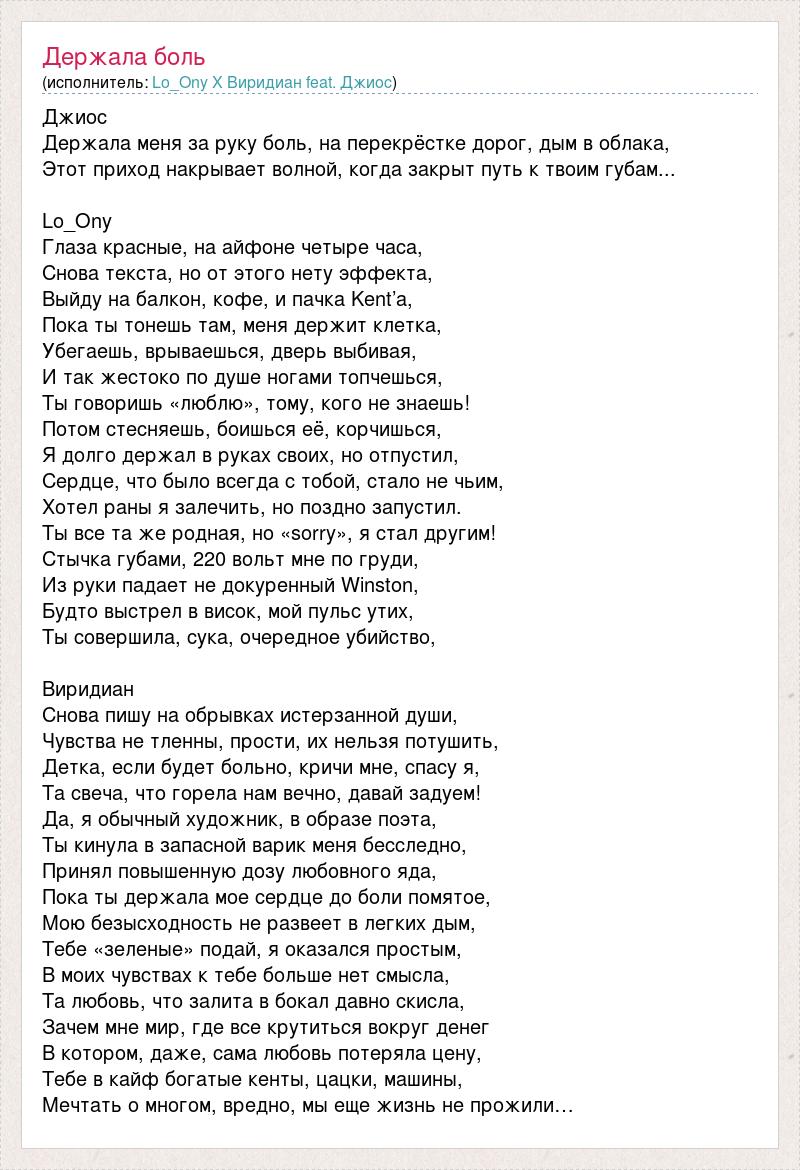 Джиос Держала меня за руку боль, на перекрёстке дорог, дым в облака, Этот приход накрывает волной, когда закрыт путь к твоим губам... Lo_Ony Глаза красные, на айфоне четыре часа, Снова текста, но от этого нету эффекта, Выйду на балкон, кофе, и пачка Kent’а, Пока ты тонешь там, меня держит клетка, Убегаешь, врываешься, дверь выбивая, И так жестоко по душе ногами топчешься, Ты говоришь «люблю», тому, кого не знаешь! Потом стесняешь, боишься её, корчишься, Я долго держал в руках своих, но отпустил, Сердце, что было всегда с тобой, стало не чьим, Хотел раны я залечить, но поздно запустил. Ты все та же родная, но «sorry», я стал другим! Стычка губами, 220 вольт мне по груди, Из руки падает не докуренный Winston, Будто выстрел в висок, мой пульс утих, Ты совершила, сука, очередное убийство, Виридиан Снова пишу на обрывках истерзанной души, Чувства не тленны, прости, их нельзя потушить, Детка, если будет больно, кричи мне, спасу я, Та свеча, что горела нам вечно, давай задуем! Да, я обычный художник, в образе поэта, Ты кинула в запасной варик меня бесследно, Принял повышенную дозу любовного яда, Пока ты держала мое сердце до боли помятое, Мою безысходность не развеет в легких дым, Тебе «зеленые» подай, я оказался простым, В моих чувствах к тебе больше нет смысла, Та любовь, что залита в бокал давно скисла, Зачем мне мир, где все крутиться вокруг денег В котором, даже, сама любовь потеряла цену, Тебе в кайф богатые кенты, цацки, машины, Мечтать о многом, вредно, мы еще жизнь не прожили…