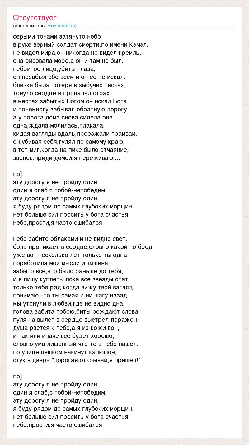 серыми тонами затянуто небо в руке верный солдат смерти,по имени Кэмэл. не видел мира,он никогда не видел кремль, она рисовала море,а он и там не был. небритое лицо,убиты глаза, он позабыл обо всем и он ее не искал. близка была потеря в зыбучих песках, тонуло сердце,и пропадал страх. в местах,забытых Богом,он искал Бога и понемногу забывал обратную дорогу, а у порога дома снова сидела она, одна,ждала,молилась,плакала. кидая взгляды вдаль,проезжали трамваи. он,убивая себя,гулял по самому краю, в тот миг,когда на пике было отчаяние, звонок:приди домой,я переживаю.... пр] эту дорогу я не пройду один, один я слаб,с тобой-непобедим. эту дорогу я не пройду один, я буду рядом до самых глубоких морщин. нет больше сил просить у бога счастья, небо,прости,я часто ошибался небо забито облаками и не видно свет, боль проникает в сердце,словно какой-то бред, уже вот несколько лет только ты одна поработила мои мысли и тишина. забыто все,что было раньше до тебя, и я пишу куплеты,пока все звезды спят. только тебе рад,когда вижу твой взгляд, понимаю,что ты самая и ни шагу назад. мы утонули в любви,где не видно дна, голова забита тобою,биты рождают слова. пуля на вылет в сердце выстрел-поражен, душа рвется к тебе,а я из кожи вон, и так или иначе все будет хорошо, словно ума лишенный что-то в тебе нашел. по улице пешком,накинут капюшон, стук в дверь:"дорогая,открывай,я пришел!" пр] эту дорогу я не пройду один, один я слаб,с тобой-непобедим. эту дорогу я не пройду один, я буду рядом до самых глубоких морщин. нет больше сил просить у бога счастья, небо,прости,я часто ошибался