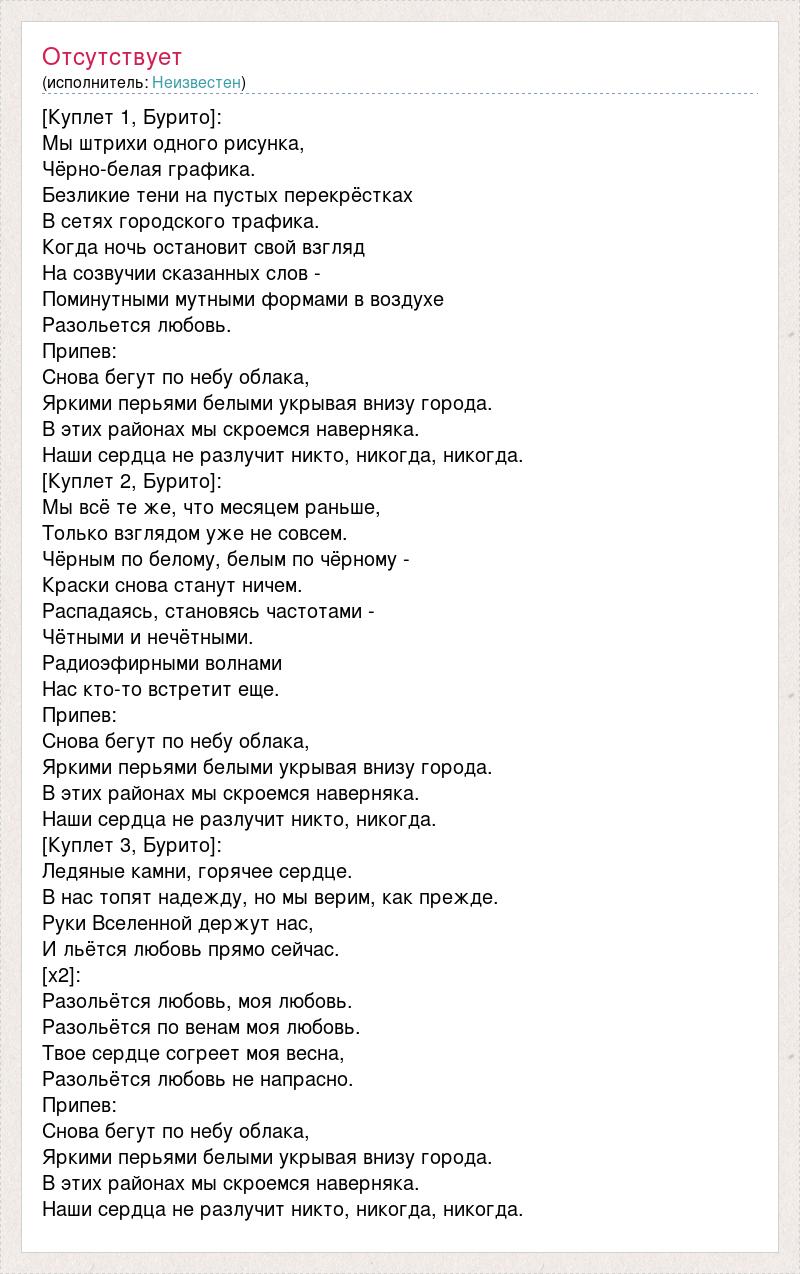 [Куплет 1, Бурито]: Мы штрихи одного рисунка, Чёрно-белая графика. Безликие тени на пустых перекрёстках В сетях городского трафика. Когда ночь остановит свой взгляд На созвучии сказанных слов - Поминутными мутными формами в воздухе Разольется любовь. Припев: Снова бегут по небу облака, Яркими перьями белыми укрывая внизу города. В этих районах мы скроемся наверняка. Наши сердца не разлучит никто, никогда, никогда. [Куплет 2, Бурито]: Мы всё те же, что месяцем раньше, Только взглядом уже не совсем. Чёрным по белому, белым по чёрному - Краски снова станут ничем. Распадаясь, становясь частотами - Чётными и нечётными. Радиоэфирными волнами Нас кто-то встретит еще. Припев: Снова бегут по небу облака, Яркими перьями белыми укрывая внизу города. В этих районах мы скроемся наверняка. Наши сердца не разлучит никто, никогда. [Куплет 3, Бурито]: Ледяные камни, горячее сердце. В нас топят надежду, но мы верим, как прежде. Руки Вселенной держут нас, И льётся любовь прямо сейчас. [x2]: Разольётся любовь, моя любовь. Разольётся по венам моя любовь. Твое сердце согреет моя весна, Разольётся любовь не напрасно. Припев: Снова бегут по небу облака, Яркими перьями белыми укрывая внизу города. В этих районах мы скроемся наверняка. Наши сердца не разлучит никто, никогда, никогда.